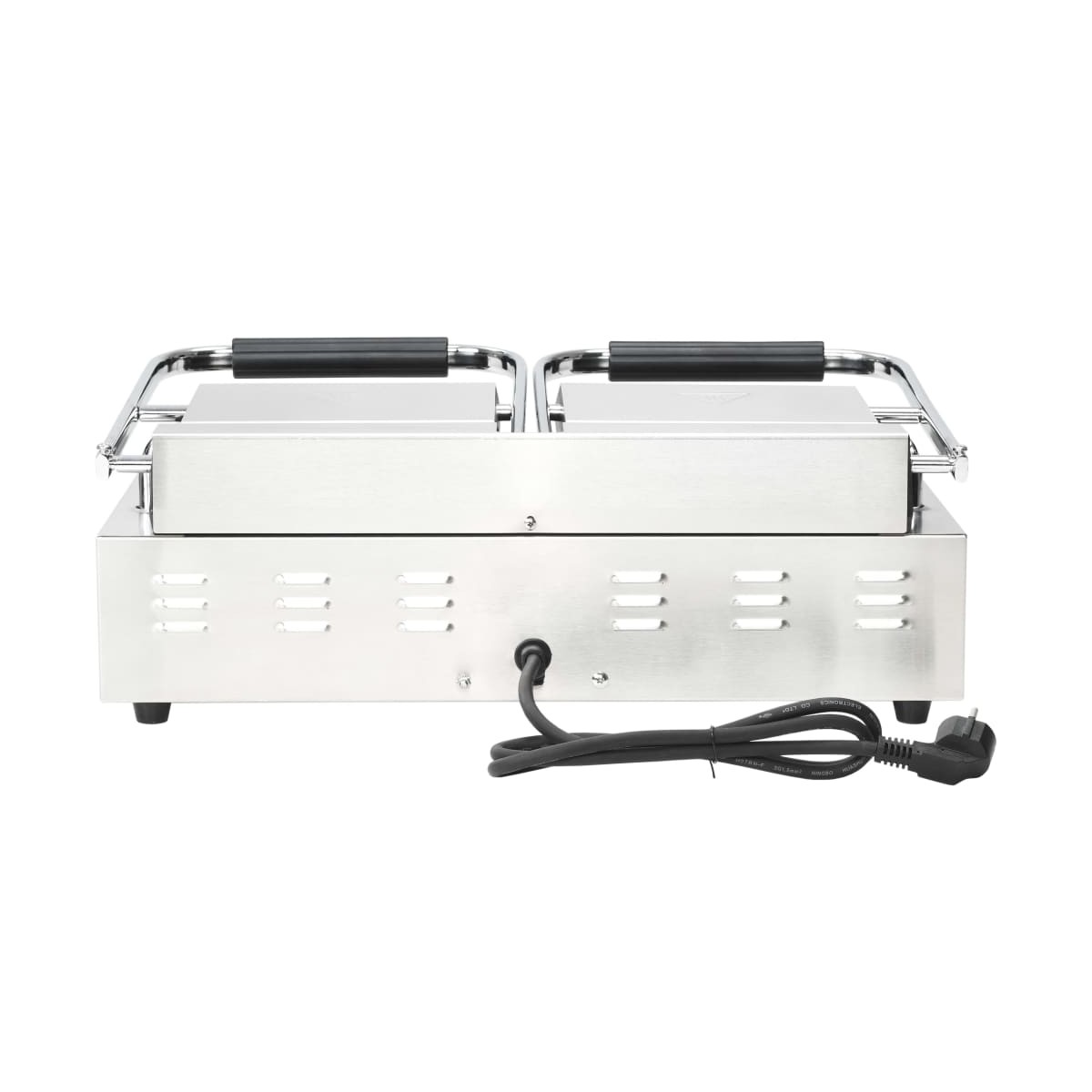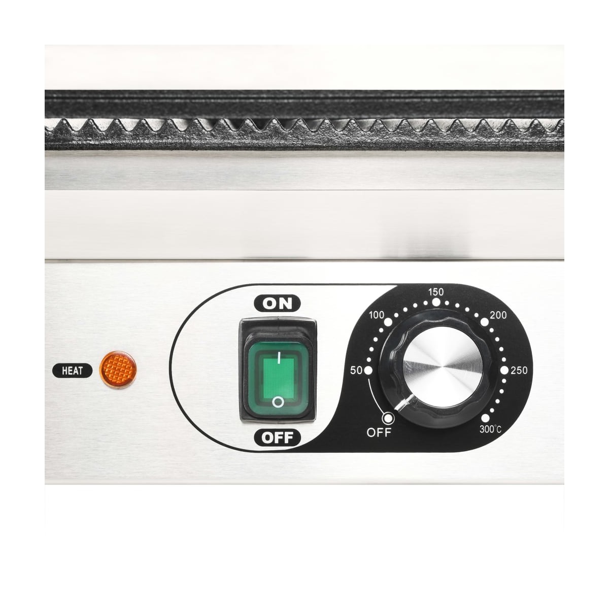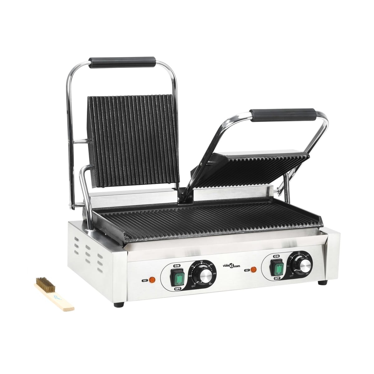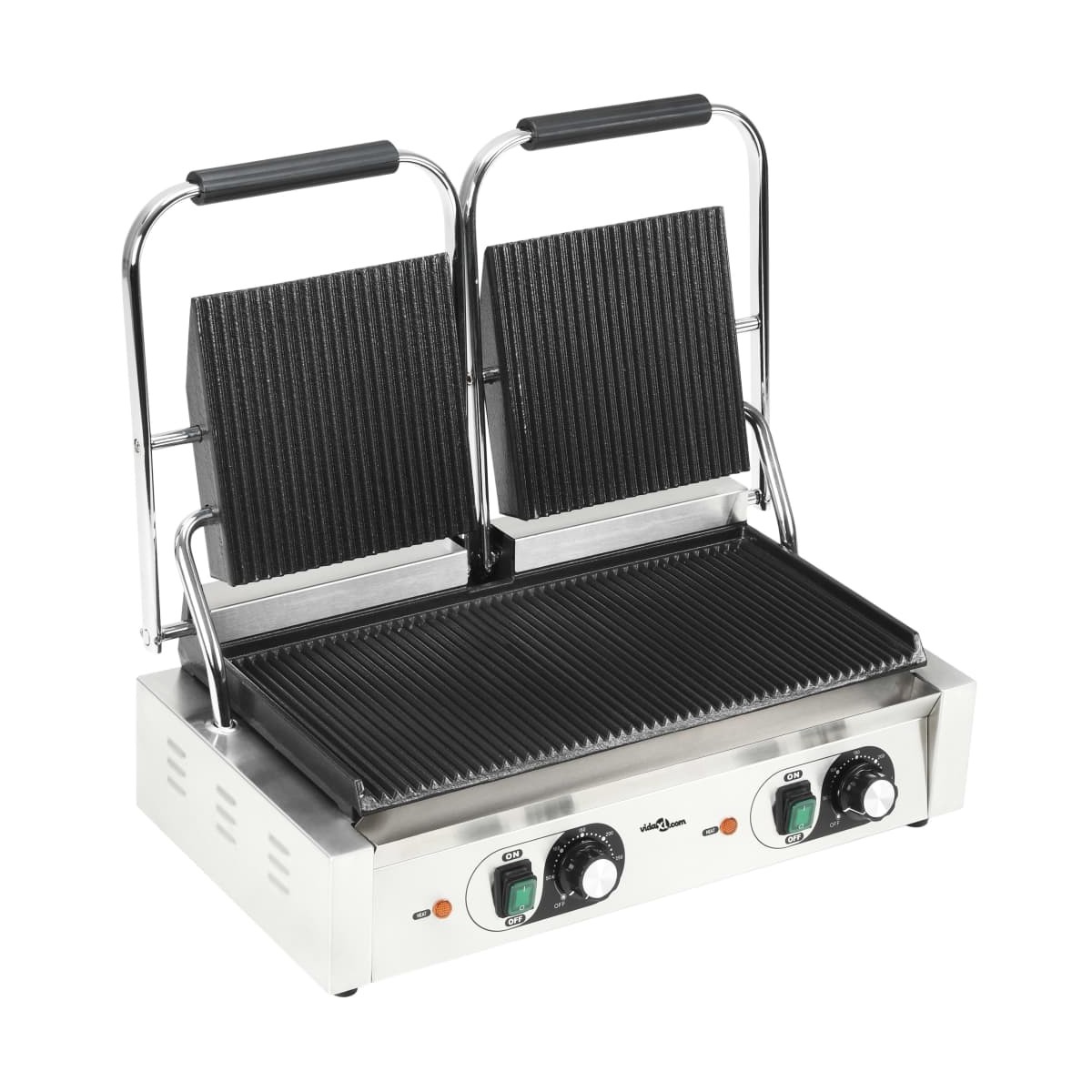 Nuestro grill acanalado doble es la opción perfecta para asar rápidamente paninis, sándwiches, hamburguesas, pollo, verduras, etc. Este grill de contacto tiene un cuerpo de acero inoxidable muy resistente que le da un buen aspecto y lo hace duradero y fácil de limpiar. Cuenta con placas ranuradas de hierro fundido para la distribución de calor uniforme y asado rápido. La parrilla está equipada con dos controladores de temperatura para los ajustes de calor variable de bajo, medio y alto. La plancha tiene una bandeja de goteo para recoger el exceso de aceite que se puede quitar fácilmente para su limpieza. Un cepillo de limpieza también se incluye en la entrega.