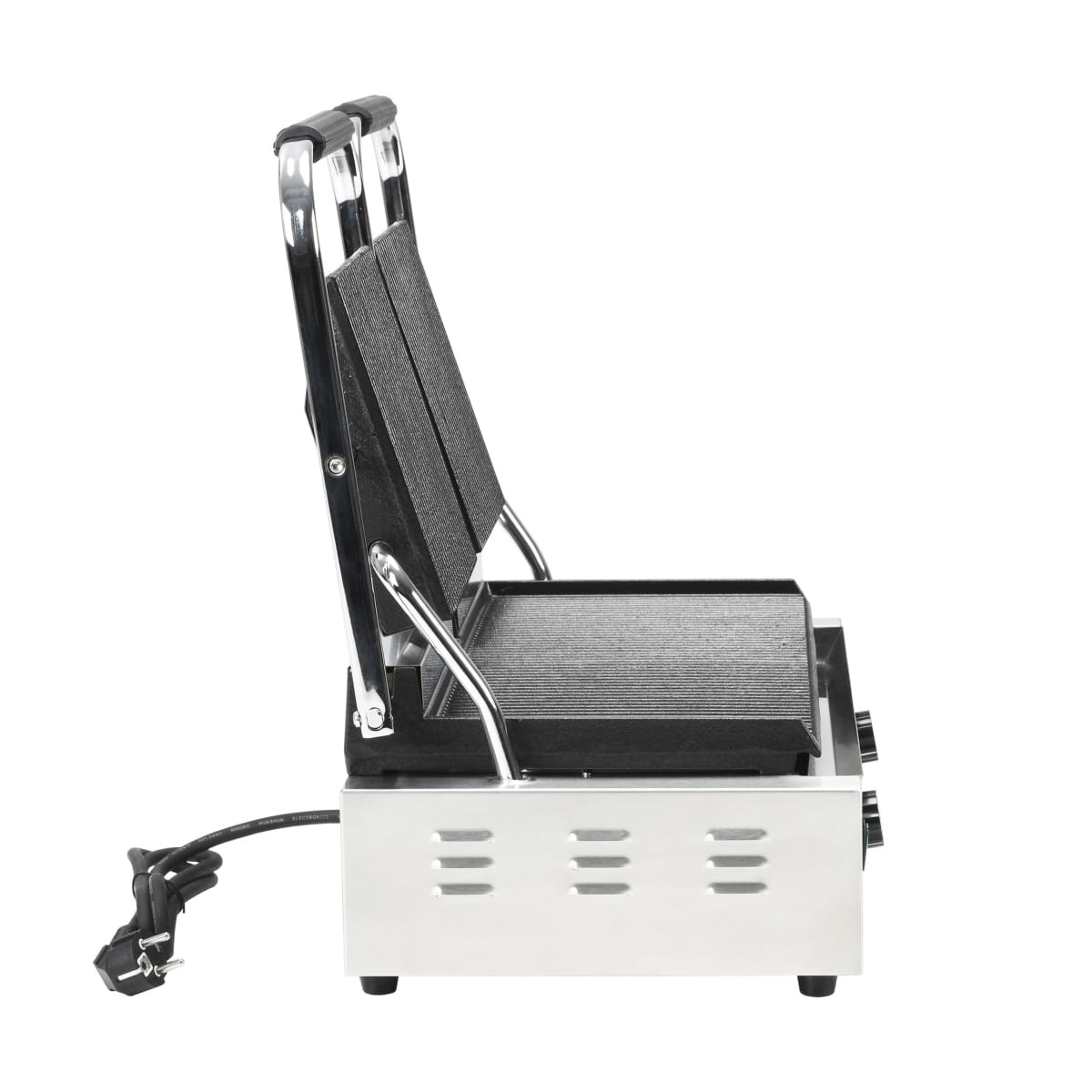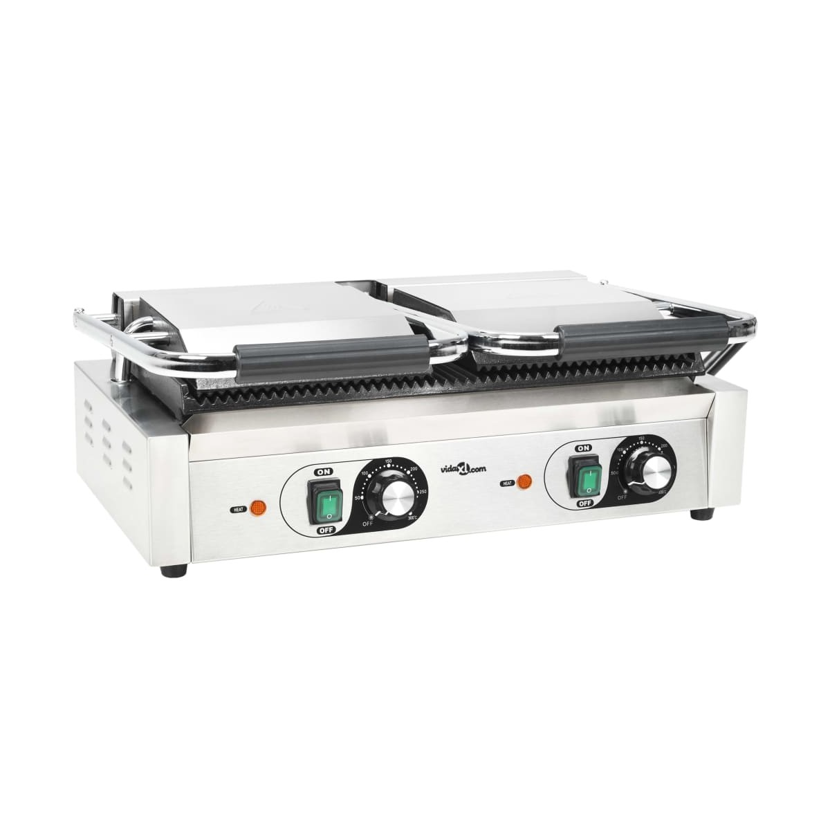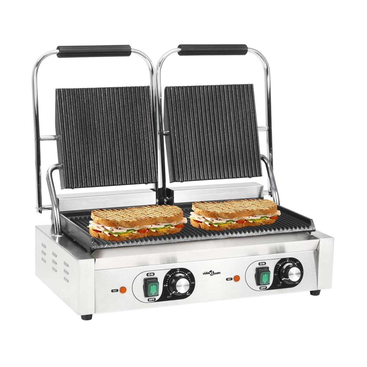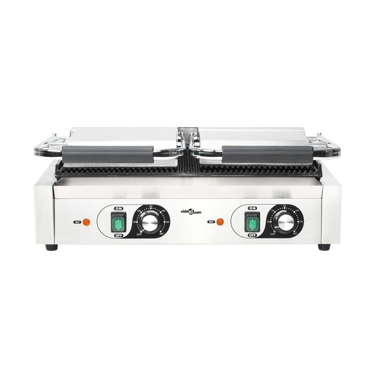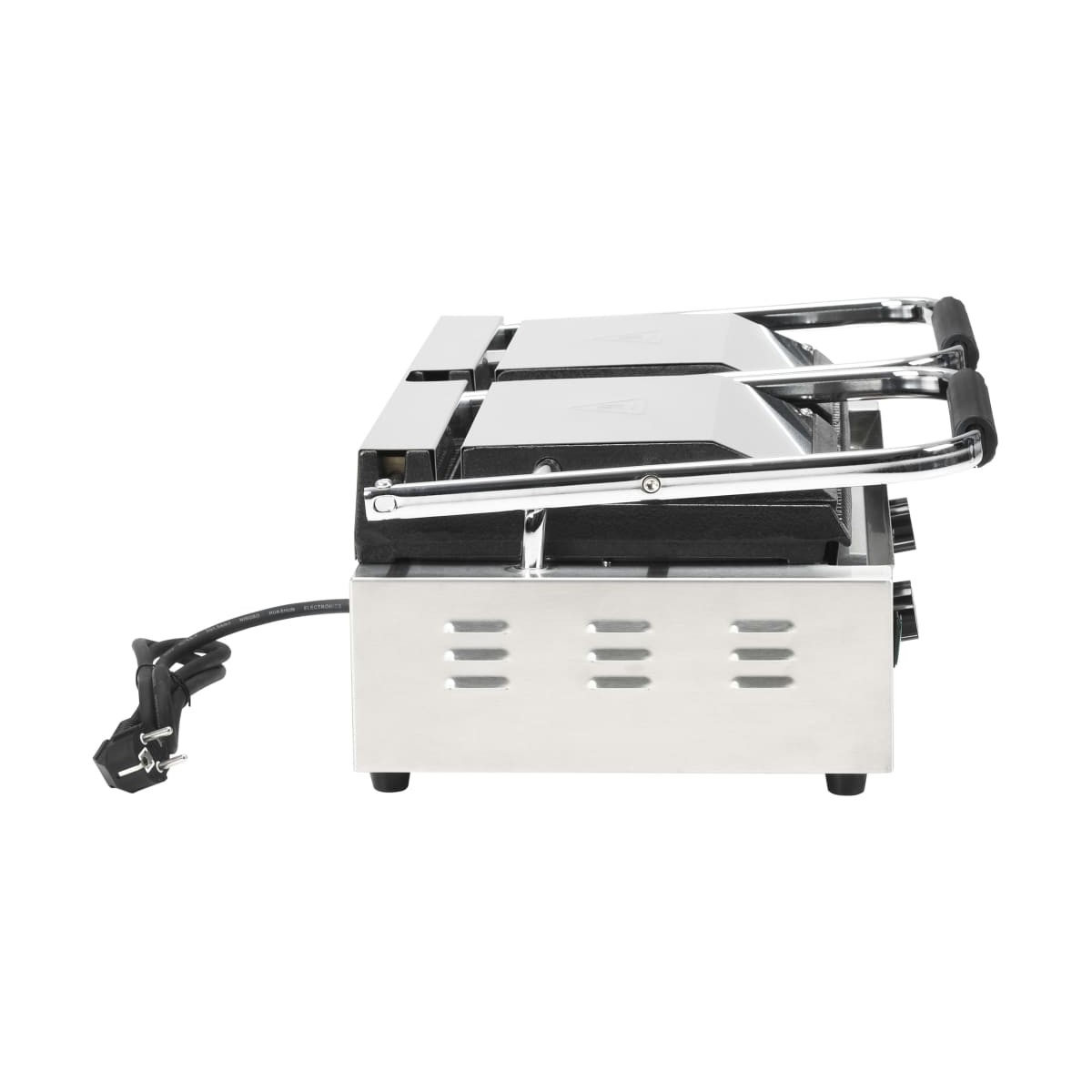 Nuestro grill acanalado doble es la opción perfecta para asar rápidamente paninis, sándwiches, hamburguesas, pollo, verduras, etc. Este grill de contacto tiene un cuerpo de acero inoxidable muy resistente que le da un buen aspecto y lo hace duradero y fácil de limpiar. Cuenta con placas ranuradas de hierro fundido para la distribución de calor uniforme y asado rápido. La parrilla está equipada con dos controladores de temperatura para los ajustes de calor variable de bajo, medio y alto. La plancha tiene una bandeja de goteo para recoger el exceso de aceite que se puede quitar fácilmente para su limpieza. Un cepillo de limpieza también se incluye en la entrega.