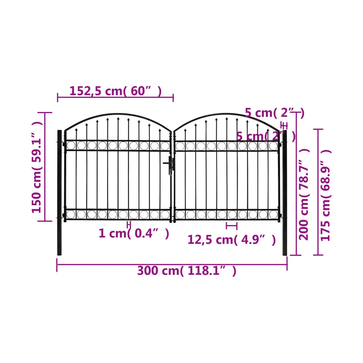 Esta puerta doble para jardín será una entrada funcional y moderna con la que aislar su jardín del mundo exterior. Muy estable y duradera, la puerta de vallado formará una práctica barrera de seguridad para su jardín, patio o terraza. Con su elegante diseño de arco y fuertes barras horizontales para reforzar el marco, nuestra puerta del jardín proporcionará un alto grado de seguridad, formando al mismo tiempo una entrada fabulosa a tu propriedad. Fabricada en acero pesado, la compuerta tiene un revestimiento en polvo contra la corrosión y el óxido. ¡Esta puerta para jardín es una gran combinación de estilo, fuerza, estabilidad y resistencia a la corrosión!