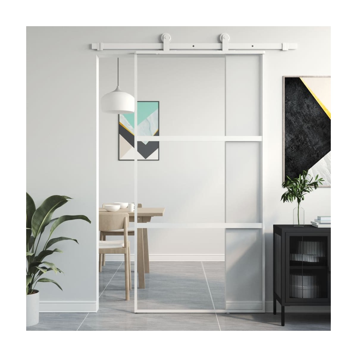 ¡Crea una transición elegante de un espacio a otro con esta puerta corredera! Material resistente: Con una estructura inteligente, el cristal templado es más fuerte y duradero que cualquier otro cristal. El vidrio templado es conocido por soportar fuerzas como altos impactos, rayones, golpes, etc.Estructura de metal robusto: Esta puerta corredera de granero tiene una estructura de aluminio para mayor durabilidad y estabilidad.Deslizamiento seguro y silencioso: Gracias al tope, la puerta corredera interior se puede abrir y cerrar silenciosamente mediante un mecanismo amortiguador.Paneles de vidrio transparente: Estos paneles de vidrio transparente dejan pasar la luz, lo que los hace perfectos para crear un salón abierto y luminoso.Diseño delgado: El diseño del marco delgado le da a la puerta corredera de vidrio una apariencia moderna y minimalista. Información útil:La puerta solo se puede montar en combinación con kits de herrajes para puertas corredizas. Puedes encontrar los kits de herrajes para puertas correderas a juego en nuestra tienda.Para la forma de instalación, puedes consultar nuestro manual de instalación de los kits de herrajes para puertas y correderas.