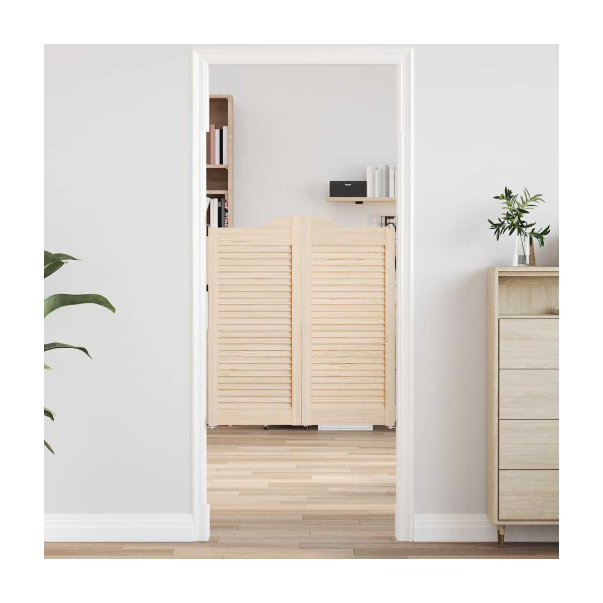 Este par de puertas batientes facilita el movimiento suave entre espacios, haciendo fácil la entrada y salida de personas. Material robusto y estable: La madera maciza de pino es conocida por su resistencia y durabilidad. Sus vetas rectas y sus característicos nudos contribuyen a su encanto rústico.Uso versátil: estas puertas de barra son versátiles y se pueden usar como puertas de cerca, puertas divisorias, puertas de gabinetes o puertas de entrada, lo que las hace ideales para cafés, bares, cocinas, jardines, pasillos, baños y más.Diseño de lamas: el diseño de lamas mejora la ventilación y aporta un estilo distintivo. Permite la entrada de luz y aire, al mismo tiempo que garantiza la privacidad, creando una sensación de amplitud sin exposición total.Estilos personalizados: Estas puertas de salón están hechas de madera de pino sin tratar, y puedes mantener su color natural o personalizarlas con pintura o laca según tus preferencias. Información útil:Las bisagras y los accesorios de montaje se venden por separado.