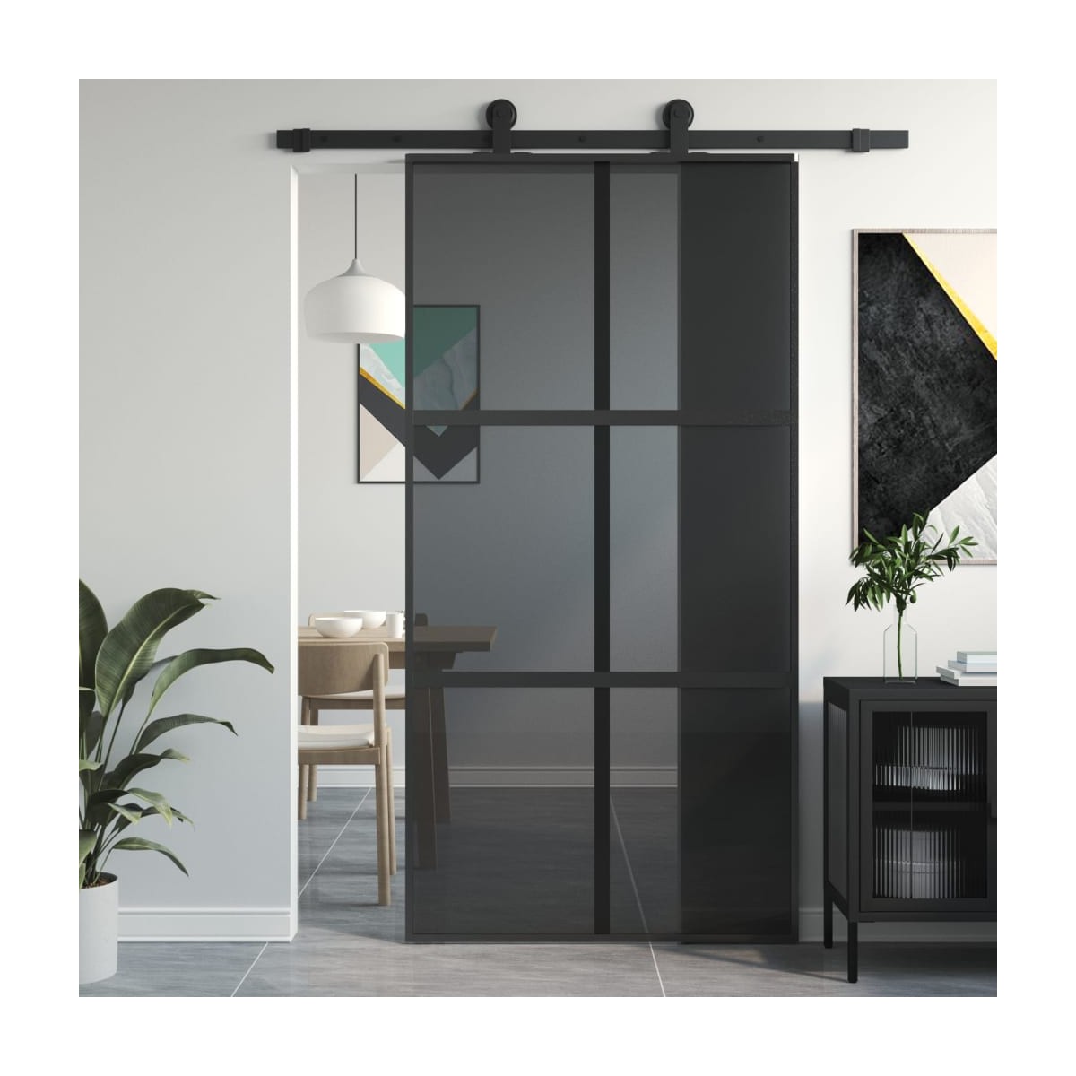 ¡Crea una transición elegante de un espacio a otro con esta puerta corredera! Material resistente: Con una estructura inteligente, el cristal templado es más fuerte y duradero que cualquier otro cristal. El vidrio templado es conocido por soportar fuerzas como altos impactos, rayones, golpes, etc.Estructura de metal robusto: Esta puerta corredera de granero tiene una estructura de aluminio para mayor durabilidad y estabilidad.Deslizamiento seguro y silencioso: Gracias al tope, la puerta corredera interior se puede abrir y cerrar silenciosamente mediante un mecanismo amortiguador.Gran privacidad: El panel de la puerta está hecho de vidrio transparente oscuro, para proteger tu intimidad en casa y en la oficina.Diseño delgado: El diseño del marco delgado le da a la puerta corredera de vidrio una apariencia moderna y minimalista. Información útil:La puerta solo se puede montar en combinación con kits de herrajes para puertas corredizas. Puedes encontrar los kits de herrajes para puertas correderas a juego en nuestra tienda.Para la forma de instalación, puedes consultar nuestro manual de instalación de los kits de herrajes para puertas y correderas.