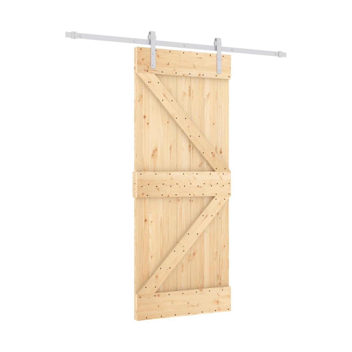 Esta puerta corredera de madera maciza de pino está diseñada para embellecer la zona de entrada de la casa y también para garantizar una mayor seguridad para el hogar. Madera maciza de pino: La puerta interior es de madera maciza de pino. La madera maciza de pino es un bonito material natural. La madera de pino tiene vetas rectas, y los nudos dan al material su distintivo aspecto rústico.Rieles deslizantes resistentes: El acero es un material muy duro y resistente, que ofrece solidez y estabilidad. El recubrimiento en polvo del acero crea una capa protectora contra el desgaste. Hechos de acero con recubrimiento de polvo, los rieles deslizantes son robustos, duraderos y resistentes.Deslizamiento suave y silencioso: Gracias a los rodamientos internos, la puerta corredera interior se deslizará de forma suave y silenciosa. También se incluyen topes de puerta para evitar el descarrilamiento de los rodillos, mientras que las juntas de goma amortiguarán el golpe de los rodillos y reducirán el ruido.Diseño que ahorra espacio: Esta puerta corredera de madera ahorra espacio y parece más amplia. Es la primera opción para un diseño de hogar moderno, sencillo y con un bonito ambiente.Amplio uso: La puerta corredera de granero se puede instalar tanto en paredes de madera como en paredes de hormigón. Es ideal para usar en el dormitorio, la cocina, el granero, el garaje, etc.