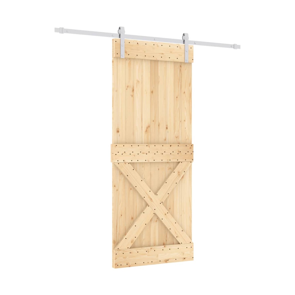 Esta puerta corredera de madera maciza de pino está diseñada para embellecer la zona de entrada de la casa y también para garantizar una mayor seguridad para el hogar. Madera maciza de pino: La puerta interior es de madera maciza de pino. La madera maciza de pino es un bonito material natural. La madera de pino tiene vetas rectas, y los nudos dan al material su distintivo aspecto rústico.Rieles deslizantes resistentes: El acero es un material muy duro y resistente, que ofrece solidez y estabilidad. El recubrimiento en polvo del acero crea una capa protectora contra el desgaste. Hechos de acero con recubrimiento de polvo, los rieles deslizantes son robustos, duraderos y resistentes.Deslizamiento suave y silencioso: Gracias a los rodamientos internos, la puerta corredera interior se deslizará de forma suave y silenciosa. También se incluyen topes de puerta para evitar el descarrilamiento de los rodillos, mientras que las juntas de goma amortiguarán el golpe de los rodillos y reducirán el ruido.Diseño que ahorra espacio: Esta puerta corredera de madera ahorra espacio y parece más amplia. Es la primera opción para un diseño de hogar moderno, sencillo y con un bonito ambiente.Amplio uso: La puerta corredera de granero se puede instalar tanto en paredes de madera como en paredes de hormigón. Es ideal para usar en el dormitorio, la cocina, el granero, el garaje, etc.