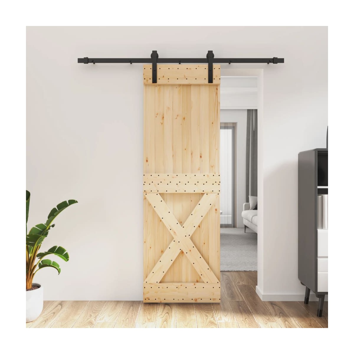 Esta puerta corredera de madera maciza de pino está diseñada para embellecer la zona de entrada de la casa y también para garantizar una mayor seguridad para el hogar. Madera maciza de pino: La puerta interior es de madera maciza de pino. La madera maciza de pino es un bonito material natural. La madera de pino tiene vetas rectas, y los nudos dan al material su distintivo aspecto rústico.Rieles deslizantes resistentes: El acero es un material muy duro y resistente, que ofrece solidez y estabilidad. El recubrimiento en polvo del acero crea una capa protectora contra el desgaste. Hechos de acero con recubrimiento de polvo, los rieles deslizantes son robustos, duraderos y resistentes.Deslizamiento suave y silencioso: Gracias a los rodamientos internos, la puerta corredera interior se deslizará de forma suave y silenciosa. También se incluyen topes de puerta para evitar el descarrilamiento de los rodillos, mientras que las juntas de goma amortiguarán el golpe de los rodillos y reducirán el ruido.Diseño que ahorra espacio: Esta puerta corredera de madera ahorra espacio y parece más amplia. Es la primera opción para un diseño de hogar moderno, sencillo y con un bonito ambiente.Amplio uso: La puerta corredera de granero se puede instalar tanto en paredes de madera como en paredes de hormigón. Es ideal para usar en el dormitorio, la cocina, el granero, el garaje, etc.