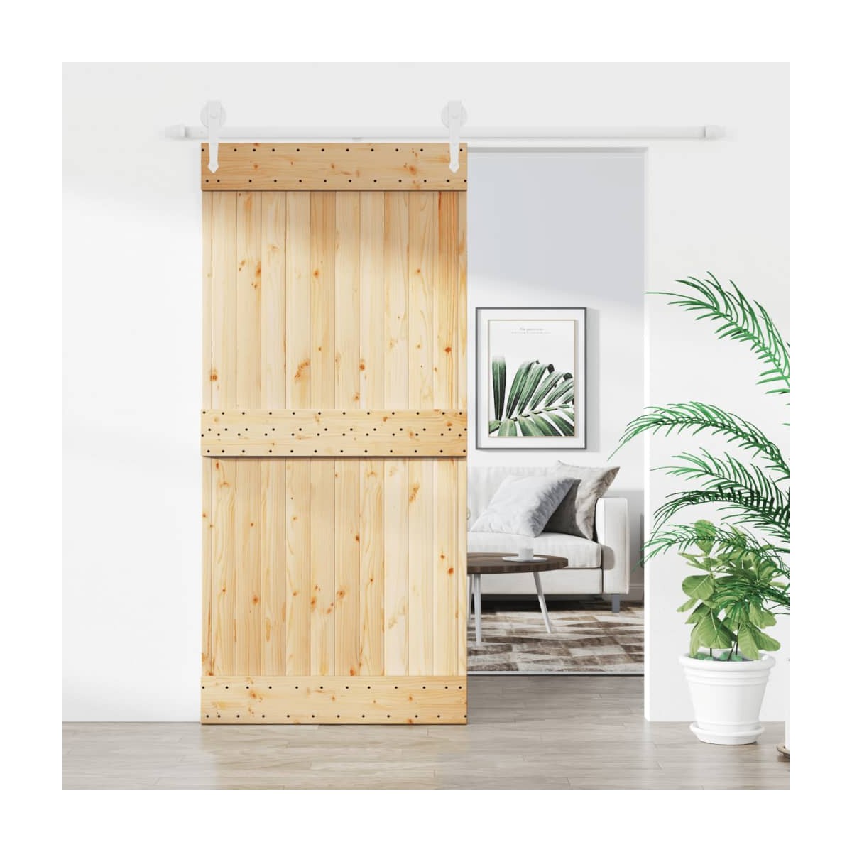 Esta puerta corredera de madera maciza de pino está diseñada para embellecer la zona de entrada de la casa y también para garantizar una mayor seguridad para el hogar. Madera maciza de pino: La puerta interior es de madera maciza de pino. La madera maciza de pino es un bonito material natural. La madera de pino tiene vetas rectas, y los nudos dan al material su distintivo aspecto rústico.Rieles deslizantes resistentes: El acero es un material muy duro y resistente, que ofrece solidez y estabilidad. El recubrimiento en polvo del acero crea una capa protectora contra el desgaste. Hechos de acero con recubrimiento de polvo, los rieles deslizantes son robustos, duraderos y resistentes.Deslizamiento suave y silencioso: Gracias a los rodamientos internos, la puerta corredera interior se deslizará de forma suave y silenciosa. También se incluyen topes de puerta para evitar el descarrilamiento de los rodillos, mientras que las juntas de goma amortiguarán el golpe de los rodillos y reducirán el ruido.Diseño que ahorra espacio: Esta puerta corredera de madera ahorra espacio y parece más amplia. Es la primera opción para un diseño de hogar moderno, sencillo y con un bonito ambiente.Amplio uso: La puerta corredera de granero se puede instalar tanto en paredes de madera como en paredes de hormigón. Es ideal para usar en el dormitorio, la cocina, el granero, el garaje, etc.