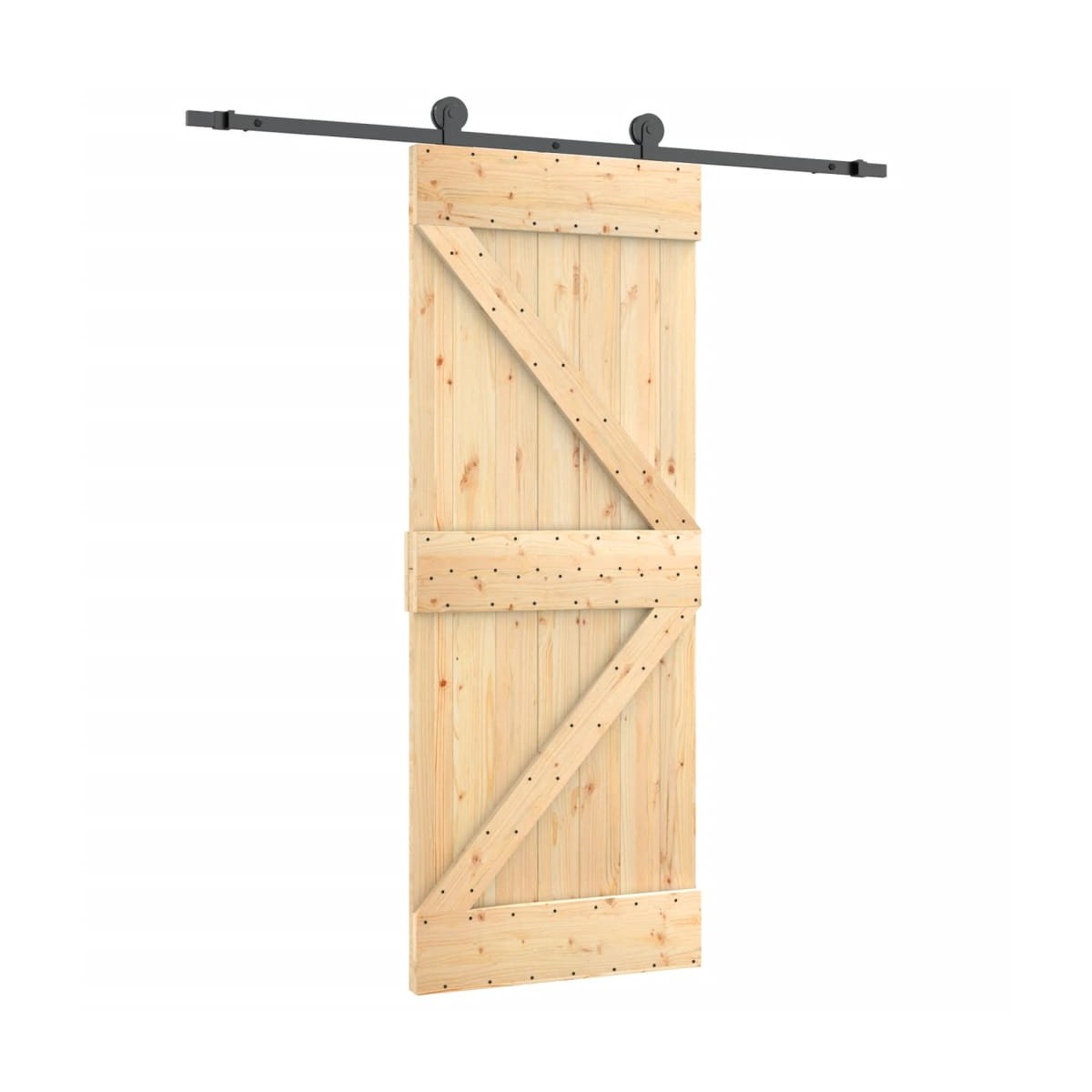 Esta puerta corredera de madera maciza de pino está diseñada para embellecer la zona de entrada de la casa y también para garantizar una mayor seguridad para el hogar. Madera maciza de pino: La puerta interior es de madera maciza de pino. La madera maciza de pino es un bonito material natural. La madera de pino tiene vetas rectas, y los nudos dan al material su distintivo aspecto rústico.Rieles deslizantes resistentes: El acero es un material muy duro y resistente, que ofrece solidez y estabilidad. El recubrimiento en polvo del acero crea una capa protectora contra el desgaste. Hechos de acero con recubrimiento de polvo, los rieles deslizantes son robustos, duraderos y resistentes.Deslizamiento suave y silencioso: Gracias a los rodamientos internos, la puerta corredera interior se deslizará de forma suave y silenciosa. También se incluyen topes de puerta para evitar el descarrilamiento de los rodillos, mientras que las juntas de goma amortiguarán el golpe de los rodillos y reducirán el ruido.Diseño que ahorra espacio: Esta puerta corredera de madera ahorra espacio y parece más amplia. Es la primera opción para un diseño de hogar moderno, sencillo y con un bonito ambiente.Amplio uso: La puerta corredera de granero se puede instalar tanto en paredes de madera como en paredes de hormigón. Es ideal para usar en el dormitorio, la cocina, el granero, el garaje, etc.
