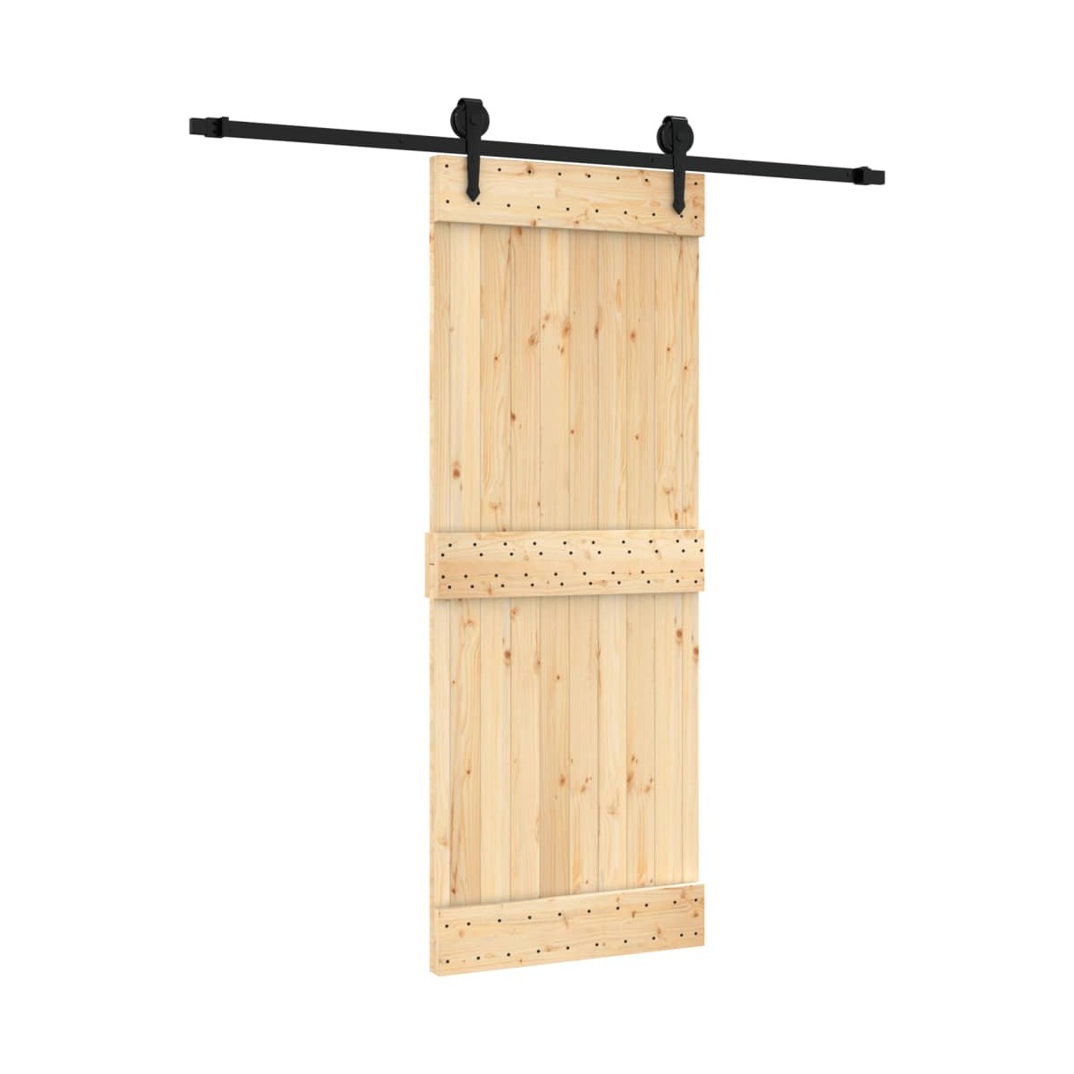 Esta puerta corredera de madera maciza de pino está diseñada para embellecer la zona de entrada de la casa y también para garantizar una mayor seguridad para el hogar. Madera maciza de pino: La puerta interior es de madera maciza de pino. La madera maciza de pino es un bonito material natural. La madera de pino tiene vetas rectas, y los nudos dan al material su distintivo aspecto rústico.Rieles deslizantes resistentes: El acero es un material muy duro y resistente, que ofrece solidez y estabilidad. El recubrimiento en polvo del acero crea una capa protectora contra el desgaste. Hechos de acero con recubrimiento de polvo, los rieles deslizantes son robustos, duraderos y resistentes.Deslizamiento suave y silencioso: Gracias a los rodamientos internos, la puerta corredera interior se deslizará de forma suave y silenciosa. También se incluyen topes de puerta para evitar el descarrilamiento de los rodillos, mientras que las juntas de goma amortiguarán el golpe de los rodillos y reducirán el ruido.Diseño que ahorra espacio: Esta puerta corredera de madera ahorra espacio y parece más amplia. Es la primera opción para un diseño de hogar moderno, sencillo y con un bonito ambiente.Amplio uso: La puerta corredera de granero se puede instalar tanto en paredes de madera como en paredes de hormigón. Es ideal para usar en el dormitorio, la cocina, el granero, el garaje, etc.