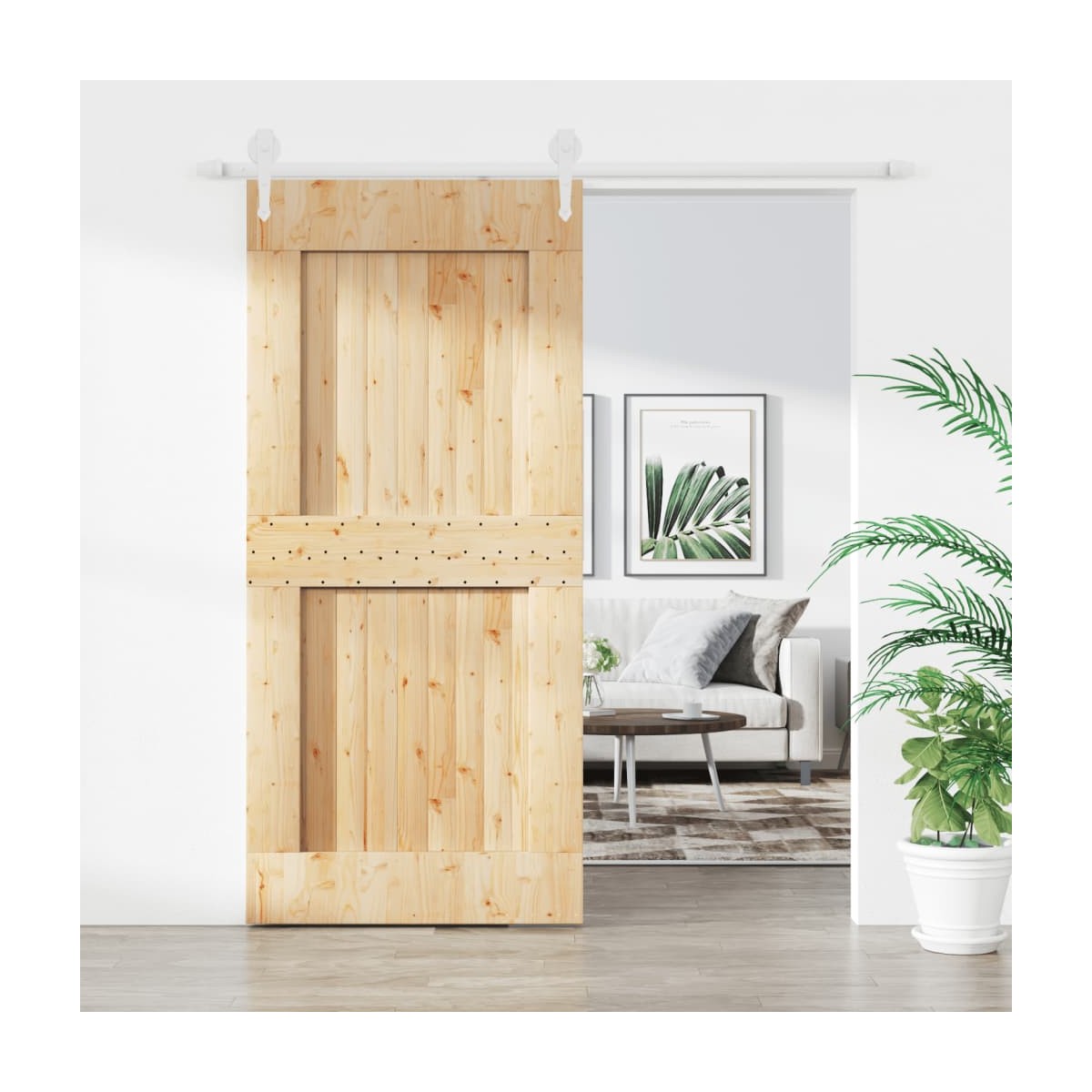 Esta puerta corredera de madera maciza de pino está diseñada para embellecer la zona de entrada de la casa y también para garantizar una mayor seguridad para el hogar. Madera maciza de pino: La puerta interior es de madera maciza de pino. La madera maciza de pino es un bonito material natural. La madera de pino tiene vetas rectas, y los nudos dan al material su distintivo aspecto rústico.Rieles deslizantes resistentes: El acero es un material muy duro y resistente, que ofrece solidez y estabilidad. El recubrimiento en polvo del acero crea una capa protectora contra el desgaste. Hechos de acero con recubrimiento de polvo, los rieles deslizantes son robustos, duraderos y resistentes.Deslizamiento suave y silencioso: Gracias a los rodamientos internos, la puerta corredera interior se deslizará de forma suave y silenciosa. También se incluyen topes de puerta para evitar el descarrilamiento de los rodillos, mientras que las juntas de goma amortiguarán el golpe de los rodillos y reducirán el ruido.Diseño que ahorra espacio: Esta puerta corredera de madera ahorra espacio y parece más amplia. Es la primera opción para un diseño de hogar moderno, sencillo y con un bonito ambiente.Amplio uso: La puerta corredera de granero se puede instalar tanto en paredes de madera como en paredes de hormigón. Es ideal para usar en el dormitorio, la cocina, el granero, el garaje, etc.