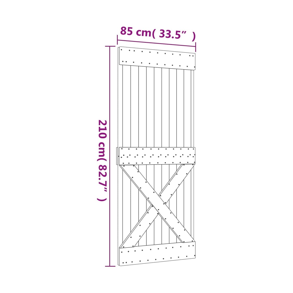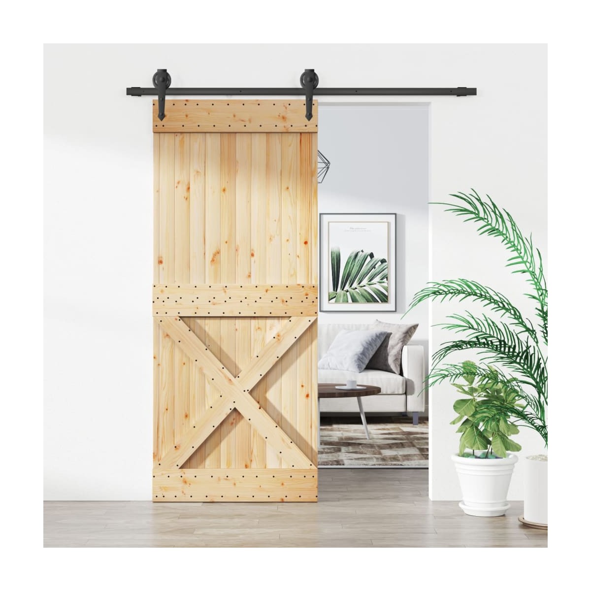 Esta puerta corredera de madera maciza de pino está diseñada para embellecer la zona de entrada de la casa y también para garantizar una mayor seguridad para el hogar. Madera maciza de pino: La puerta interior es de madera maciza de pino. La madera maciza de pino es un bonito material natural. La madera de pino tiene vetas rectas, y los nudos dan al material su distintivo aspecto rústico.Rieles deslizantes resistentes: El acero es un material muy duro y resistente, que ofrece solidez y estabilidad. El recubrimiento en polvo del acero crea una capa protectora contra el desgaste. Hechos de acero con recubrimiento de polvo, los rieles deslizantes son robustos, duraderos y resistentes.Deslizamiento suave y silencioso: Gracias a los rodamientos internos, la puerta corredera interior se deslizará de forma suave y silenciosa. También se incluyen topes de puerta para evitar el descarrilamiento de los rodillos, mientras que las juntas de goma amortiguarán el golpe de los rodillos y reducirán el ruido.Diseño que ahorra espacio: Esta puerta corredera de madera ahorra espacio y parece más amplia. Es la primera opción para un diseño de hogar moderno, sencillo y con un bonito ambiente.Amplio uso: La puerta corredera de granero se puede instalar tanto en paredes de madera como en paredes de hormigón. Es ideal para usar en el dormitorio, la cocina, el granero, el garaje, etc.