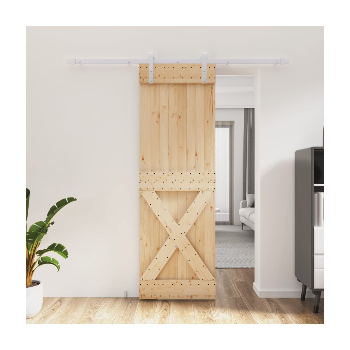 Esta puerta corredera de madera maciza de pino está diseñada para embellecer la zona de entrada de la casa y también para garantizar una mayor seguridad para el hogar. Madera maciza de pino: La puerta interior es de madera maciza de pino. La madera maciza de pino es un bonito material natural. La madera de pino tiene vetas rectas, y los nudos dan al material su distintivo aspecto rústico.Rieles deslizantes resistentes: El acero es un material muy duro y resistente, que ofrece solidez y estabilidad. El recubrimiento en polvo del acero crea una capa protectora contra el desgaste. Hechos de acero con recubrimiento de polvo, los rieles deslizantes son robustos, duraderos y resistentes.Deslizamiento suave y silencioso: Gracias a los rodamientos internos, la puerta corredera interior se deslizará de forma suave y silenciosa. También se incluyen topes de puerta para evitar el descarrilamiento de los rodillos, mientras que las juntas de goma amortiguarán el golpe de los rodillos y reducirán el ruido.Diseño que ahorra espacio: Esta puerta corredera de madera ahorra espacio y parece más amplia. Es la primera opción para un diseño de hogar moderno, sencillo y con un bonito ambiente.Amplio uso: La puerta corredera de granero se puede instalar tanto en paredes de madera como en paredes de hormigón. Es ideal para usar en el dormitorio, la cocina, el granero, el garaje, etc.