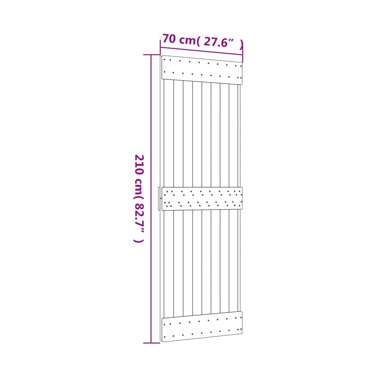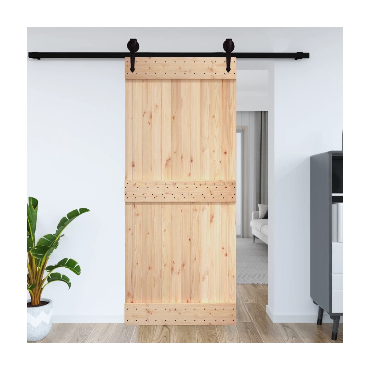 Esta puerta de madera maciza de pino está diseñada para enriquecer la entrada de la casa y para que la casa sea más segura. Madera maciza de pino: La puerta interior es de madera maciza de pino. La madera maciza de pino es un bonito material natural. La madera de pino tiene vetas rectas, y los nudos dan al material su distintivo aspecto rústico.Diseño que ahorra espacio: La puerta corredera ahorra espacio y se ve más espaciosa. Es la primera opción para un diseño de hogar moderno, sencillo y con una bonita atmósfera. Amplio uso: La puerta corredera de granero se puede instalar tanto en paredes de madera como en paredes de hormigón. Es ideal para usar en el dormitorio, la cocina, el granero, el garaje, etc. Información útil:Para complementar tu puerta NARVIK con un impresionante riel de puerta corredera, echa un vistazo a nuestra gama SKIEN. Asegúrate de que el tamaño del riel de la puerta corrediza coincida con el tamaño de su puerta antes de comprar.