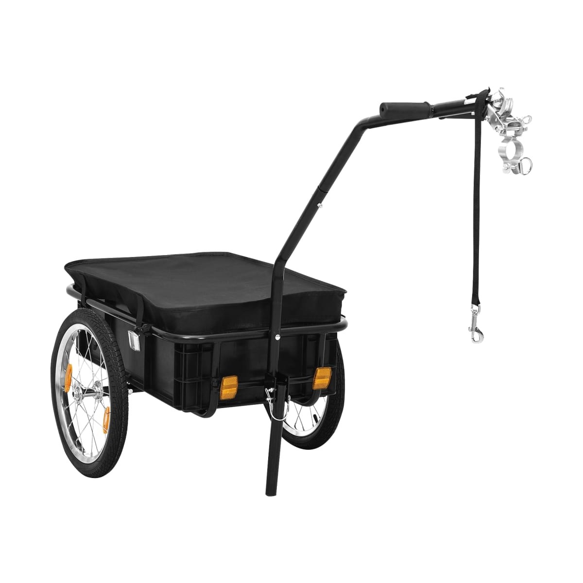Este versátil remolque para bicicletas / carrito de mano, con caja de transporte, es perfecto para desplazamientos locales o recorridos de larga distancia. Este remolque de carga para bicicletas tiene una capacidad de carga máxima de 50 kg. Diseñado con un sistema de acoplamiento de bolas para facilitar el enganche a la bicicleta. Equipado con 2 asas en la barra de tiro, este remolque de carga también puede utilizarse como carrito de mano con una capacidad de carga máxima de 70 kg. El soporte plegable permite estacionarlo de forma segura sin tener que preocuparse de que vuelque. Gracias a la construcción de la estructura de acero de alta resistencia con la caja de transporte de plástico resistente a los impactos, este remolque de carga de bicicletas / carrito de mano es muy robusto y duradero. La cubierta de nailon desmontable incluida es impermeable y resistente a la intemperie. Se han añadido reflectores de color de alta visibilidad para mejorar la seguridad. El remolque de carga para bicicletas es fácil de montar.