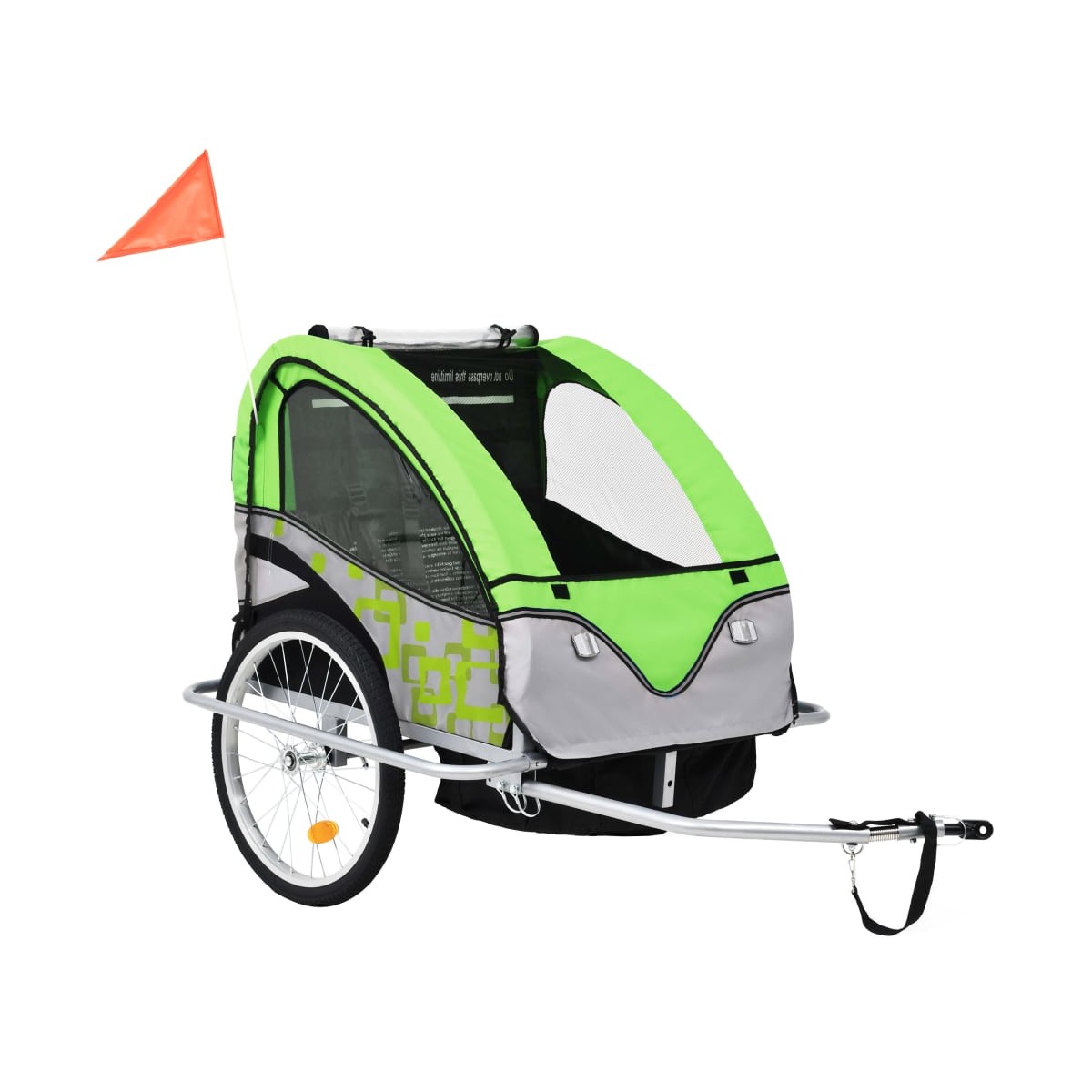 Este práctico remolque para bicicletas puede convertirse fácilmente en una silla de paseo en segundos, una excelente manera de llevar a los niños a dar un paseo o caminar. Es adecuado para 1 o 2 niños con un peso máximo total de 40 kg. Este remolque de bicicleta para niños tiene una robusta estructura de acero y está hecho de tela Oxford, por lo que es resistente al agua, duradero y fácil de mantener. La capota para todo tipo de climas y la tela de malla protegen a los niños de la lluvia y el sol, y las dos ventanas laterales transparentes ofrecen una gran visibilidad de la carretera. El sistema de arnés de seguridad de 5 puntos ofrece una seguridad óptima para tus hijos. El remolque de bicicleta para niños cuenta con colores de alta visibilidad y reflectores en las ruedas, para ofrecer la máxima visibilidad, y un freno de mano en la rueda delantera para lograr mayor seguridad al bajar cuestas. Los dos bolsillos interiores ofrecen un amplio espacio para guardar comida, juguetes y otras necesidades. La junta giratoria de seguridad garantiza que el remolque se mantenga en posición vertical si la bicicleta se cae. Este remolque de bicicleta para niños cuenta con un enganche rápido para acoplarlo fácilmente a una bicicleta. También se puede plegar para guardarlo y transportarlo fácilmente. Además, incluye una bandera de seguridad para mayor visibilidad. El montaje es sencillo.