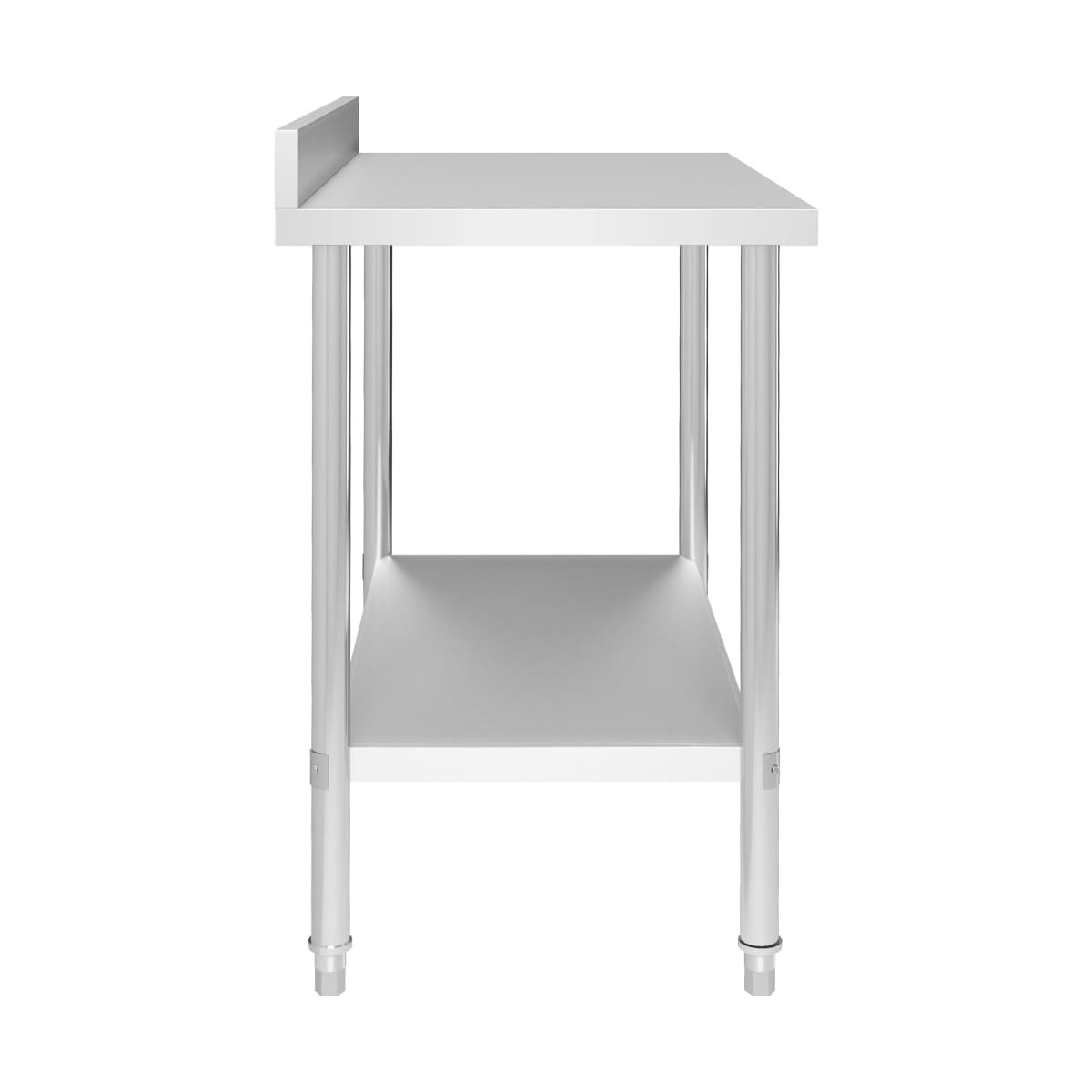 Esta alta y resistente mesa de trabajo es perfecta para preparar comida y almacenarla. Es ideal para cocinas de bares, restaurantes, escuelas u otros espacios comerciales. Está hecha de acero inoxidable de alta densidad para poder usarla mucho tiempo con un gran volumen de trabajo. Se friega y limpia con facilidad. La mesa incluye un salpicadero para ofrecer un plus de comodidad. La parte inferior está diseñada con un estante para un espacio de almacenaje personalizado. Las patas de nivelación con diseño antideslizante ofrecen gran estabilidad y protección para el suelo. La mesa de trabajo es fácil de montar. ADVERTENCIA: Para evitar el vuelco, este producto debe usarse con el dispositivo provisto para fijarlo a la pared