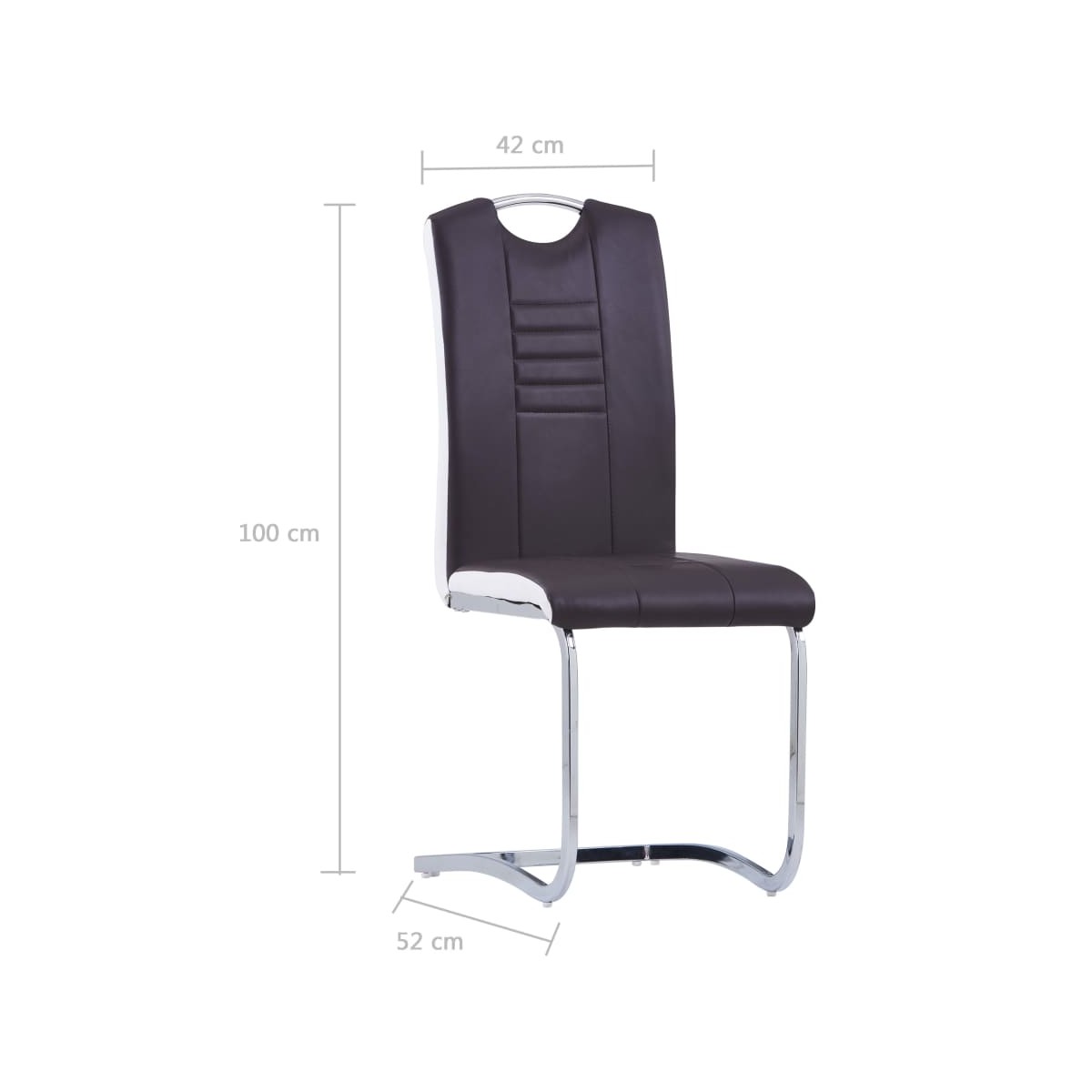 Este conjunto de sillas voladizas de comedor posee un diseño elegante y moderno, y será perfecto para tu hogar, restaurante u oficina. Las sillas de comedor están tapizadas con cuero sintético, duradero y fácil de limpiar, y acolchadas para proporcionar la máxima comodidad. El diseño ergonómico hace que la silla de comedor sea muy cómoda para acurrucarse en ella. Gracias a la estructura de acero cromado, las sillas son muy robustas y estables. Además, equipadas con una asa en el respaldo, las sillas de comedor son prácticas y se pueden mover fácilmente. La entrega incluye 4 sillas de comedor.