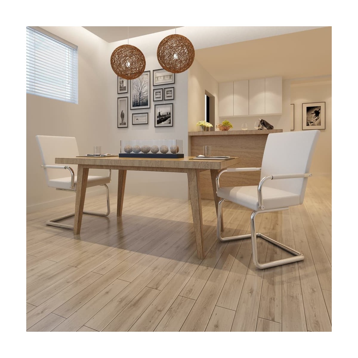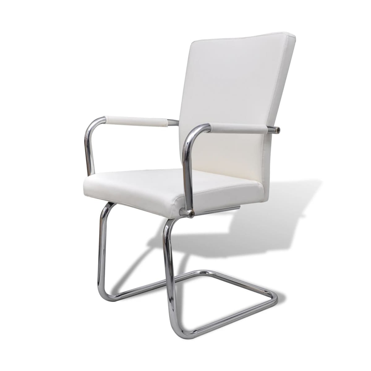 Este conjunto de 2 sillas de comedor voladizas está estética y ergonómicamente diseñado para destacar allá donde que se coloque. La cómoda silla de comedor tiene una construcción de alta calidad y robusta. Se pueden limpiar con facilidad y las patas son de hierro duradero para aportar estabilidad. Gracias al grueso acolchado del asiento y el respaldo, seguro que nuestra silla de cuero sintético te resultará muy cómoda. Su construcción duradera garantiza su uso durante muchos años. El envío incluye dos sillas blancas.