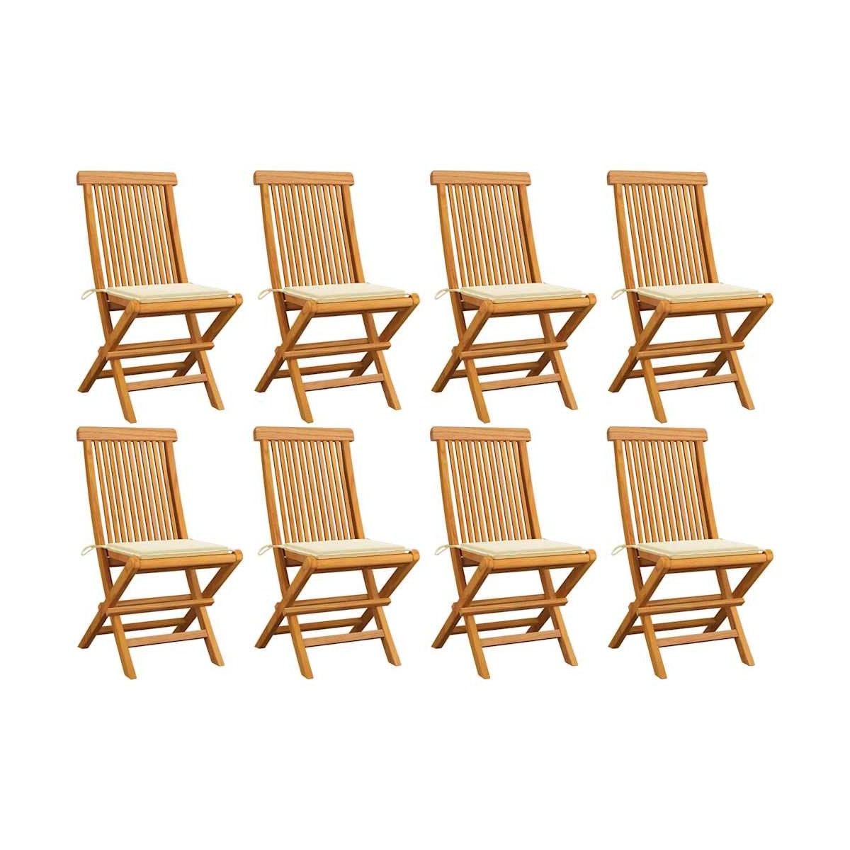 Estas sillas de jardín plegables de madera, con un diseño sencillo pero elegante, están diseñadas para brindar una cómoda experiencia de asiento. Construidas con madera maciza de teca muy duradera, estos muebles de teca han sido secados al horno y lijados finamente para darles una apariencia muy lisa. La madera de teca es conocida por su excepcional robustez y resistencia a la intemperie, lo que la hace mucho más adecuada para muebles de jardín que cualquier otro tipo de madera. La madera de teca es la elección perfecta si quieres comprar un mueble de jardín duradero. La superficie lijada es fácil de limpiar con un paño húmedo. Estas sillas de comedor de jardín también son ligeras, lo que las hace completamente flexibles y fáciles de mover. Las sillas de exterior se pueden plegar fácilmente cuando no están en uso. Además, los cojines de asiento incluidos también brindan mayor comodidad al sentarse. Nota: Para prolongar la vida útil de los muebles de exterior, te recomendamos que los limpies con regularidad y no los dejes al aire libre sin protección innecesariamente.Limpieza: Usa una solución de jabón suaveAlmacenamiento: Si es posible, guarda el producto en un lugar fresco y seco en el interior. Si el producto se almacena al aire libre, protégelo con una funda impermeable. Limpia y seca el exceso de agua o nieve de las superficies planas después de una lluvia o nevada. Permite la ventilación para evitar daños relacionados con la humedad.
