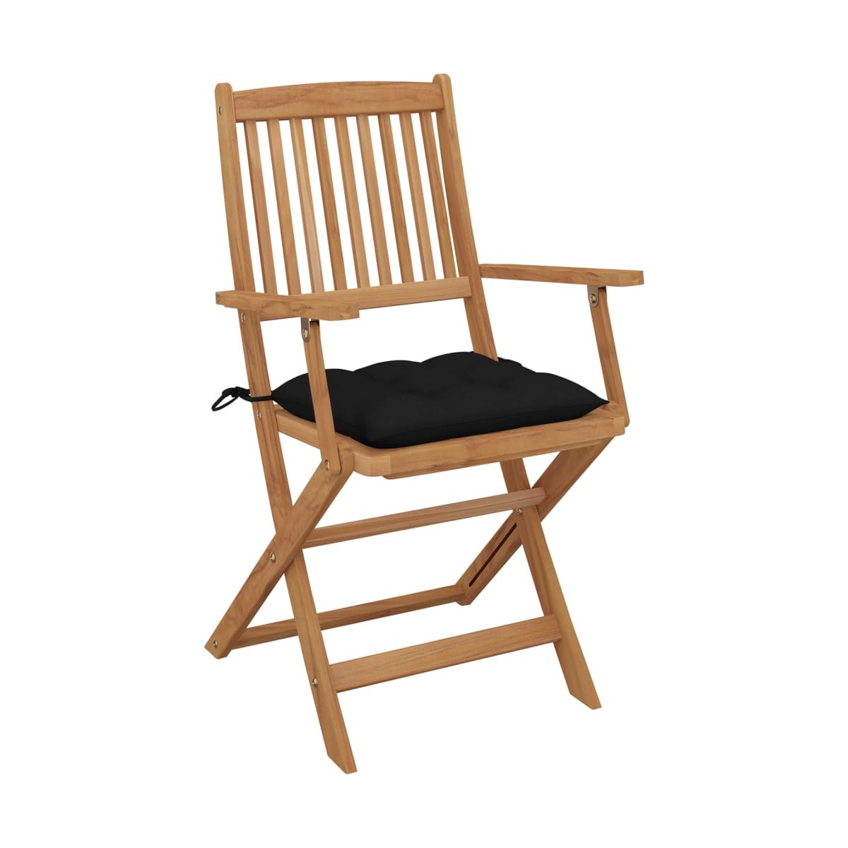 Estas sillas plegables de madera maciza de acacia con cojines proporcionan un lugar perfecto para relajarte y disfrutar del sol en el jardín o en el patio. Estas sillas de jardín están hechas de madera de acacia maciza, lo que las hace robustas y estables. La madera de acacia maciza tiene fuerza para soportar peso y es resistente al desgaste del tiempo. Por eso, estas sillas de jardín brindan años de relajación. Además, las sillas se pueden plegar para ahorrar espacio cuando no están en uso. Los cojines incluidos agregan comodidad extra. Cada cojín cuenta con dos juegos de cuerdas para fijarlo firmemente a la silla. Nota: Para prolongar la vida útil de los muebles de exterior, te recomendamos que los limpies con regularidad y no los dejes al aire libre sin protección innecesariamente.Limpieza: Usa una solución de jabón suaveAlmacenamiento: Si es posible, guarda el producto en un lugar fresco y seco en el interior. Si el producto se almacena al aire libre, protégelo con una funda impermeable. Limpia y seca el exceso de agua o nieve de las superficies planas después de una lluvia o nevada. Permite la ventilación para evitar daños relacionados con la humedad.