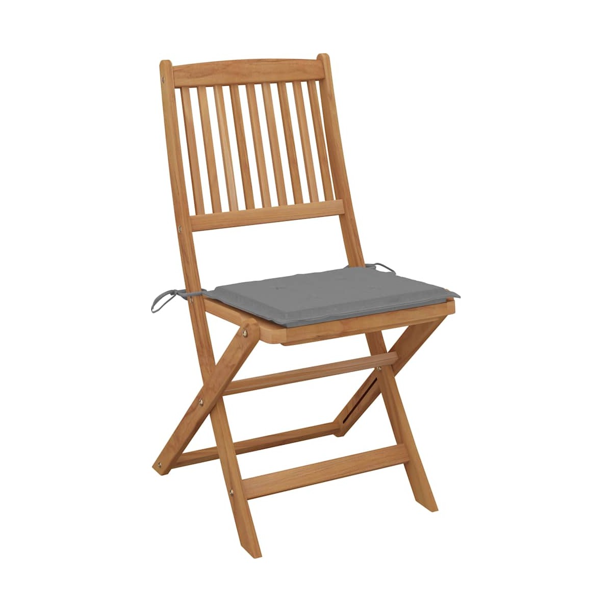 Estas sillas plegables de madera maciza de acacia con cojines proporcionan un lugar perfecto para relajarte y disfrutar del sol en el jardín o en el patio. Estas sillas de jardín están hechas de madera de acacia maciza, lo que las hace robustas y estables. La madera de acacia maciza tiene fuerza para soportar peso y es resistente al desgaste del tiempo. Por eso, estas sillas de jardín brindan años de relajación. Además, las sillas se pueden plegar para ahorrar espacio cuando no están en uso. Los cojines incluidos agregan comodidad extra. Cada cojín cuenta con dos juegos de cuerdas para fijarlo firmemente a la silla. Nota: Para prolongar la vida útil de los muebles de exterior, te recomendamos que los limpies con regularidad y no los dejes al aire libre sin protección innecesariamente.Limpieza: Usa una solución de jabón suaveAlmacenamiento: Si es posible, guarda el producto en un lugar fresco y seco en el interior. Si el producto se almacena al aire libre, protégelo con una funda impermeable. Limpia y seca el exceso de agua o nieve de las superficies planas después de una lluvia o nevada. Permite la ventilación para evitar daños relacionados con la humedad.