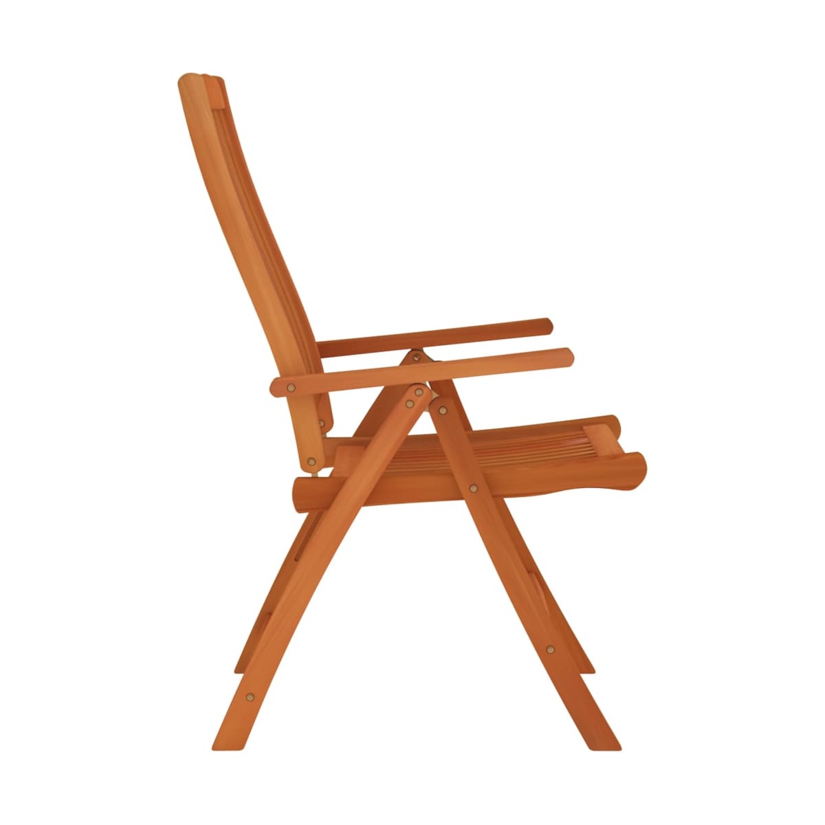Este conjunto de sillas de jardín será un gran aporte para tu jardín, terraza o patio. Madera de eucalipto maciza: La madera de eucalipto maciza es un hermoso material natural. La madera de eucalipto es muy densa y repele el agua.Cómodas posiciones reclinables: Las sillas de jardín con reposabrazos tienen respaldos y asientos curvados. Además, el respaldo se puede ajustar en 5 posiciones, para que siempre puedas encontrar una postura cómoda.Diseño plegable: Estas sillas de jardín pueden plegarse para ahorrar espacio cuando no se usen. Puedes llevarlas fácilmente a cualquier lugar en tus viajes al aire libre. Nota:Para prolongar la vida de tus muebles de exterior, te recomendamos que los protejas con una funda impermeable.