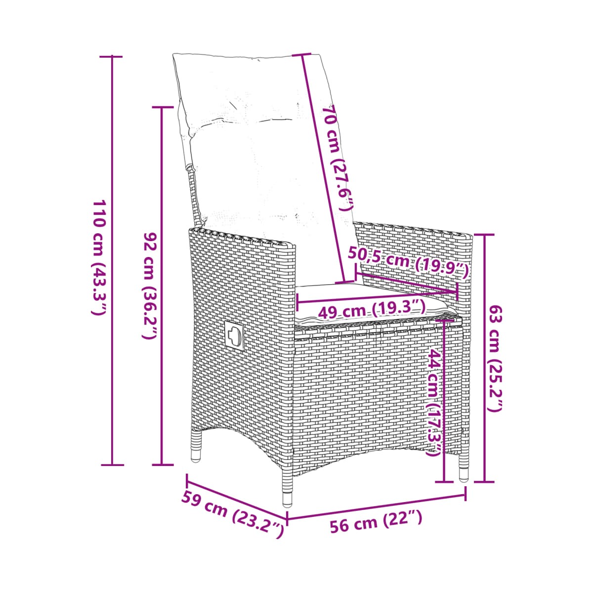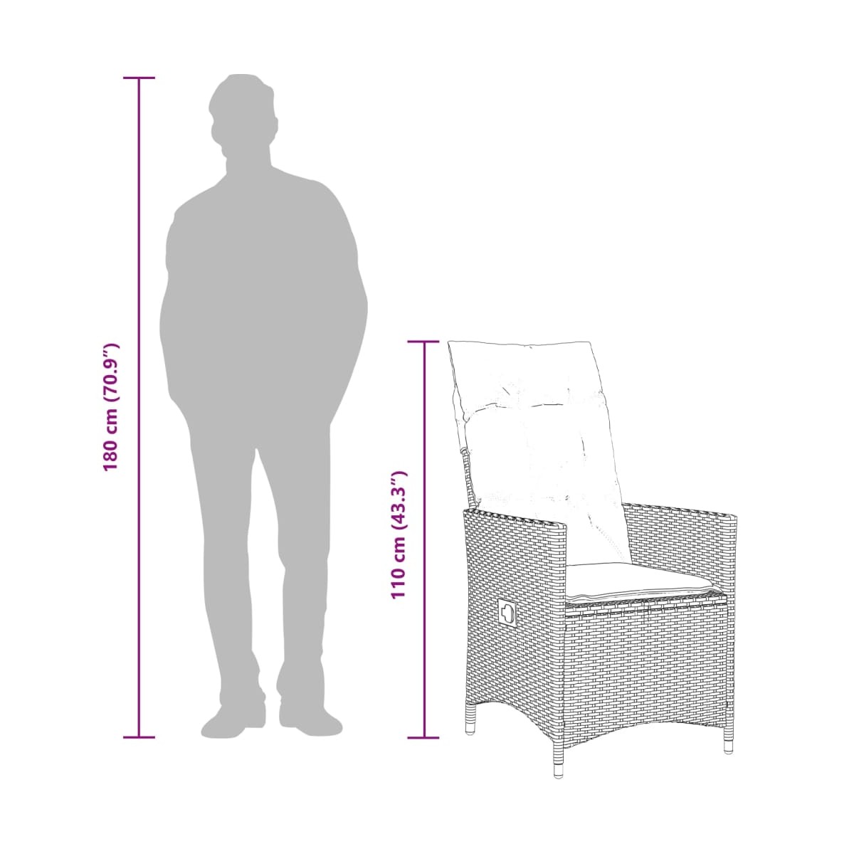 ¡Relájate y disfruta del aire libre en esta cómoda silla de jardín reclinable! Material duradero: El ratán PE, también conocido como ratán sintético, es un material sintético resistente y de bajo mantenimiento que se parece al ratán natural. Es ligero, fácil de limpiar y se usa comúnmente para muebles de exterior debido a su durabilidad y propiedades resistentes a la intemperie.Respaldo ajustable: Este asiento de jardín tiene un asa. Puedes ajustar el respaldo a cualquier posición tirando del asa y devolverlo rápidamente a su posición original.Experiencia de asiento cómoda: Estos muebles de exterior, completos con cojines acolchados gruesos, ofrecen una experiencia de asiento cómoda.Funda extraíble y lavable: El cojín del asiento cuenta con una funda extraíble para facilitar el lavado y mantenimiento. El cojín del respaldo tiene una solapa en la parte posterior para facilitar la fijación al respaldo.Estructura robusta y estable: La estructura de acero con recubrimiento en polvo garantiza que el mueble de jardín sea resistente y estable para usarlo a diario al aire libre. Información útil:Para asegurarte de que tus muebles de exterior se mantengan hermosos, recomendamos protegerlos con una funda impermeable.