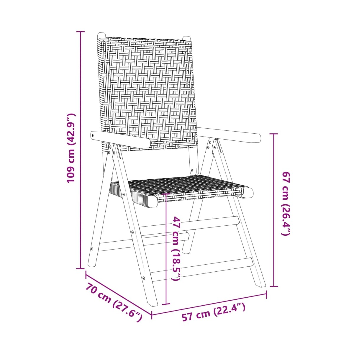 ¡Relájate y disfruta del aire libre en estas cómodas sillas de jardín!Robusta y estable: La madera maciza de acacia es conocida por su resistencia y durabilidad. Sus diversos colores y patrones de vetas únicos le dan una apariencia atractiva. Con buena estabilidad y resistencia a la intemperie, es ideal para fabricar muebles de interior y exterior.Material duradero: El ratán PE, también conocido como ratán sintético, es un material sintético resistente y de bajo mantenimiento que se parece al ratán natural. Es ligero, fácil de limpiar y se usa comúnmente para muebles de exterior debido a su durabilidad y propiedades resistentes a la intemperie.Función reclinable: El asiento de jardín está especialmente diseñado con una función reclinable para que puedas ajustar el respaldo según tu comodidad.Fácil de transportar y almacenar: la silla se puede plegar con facilidad cuando no se use, para facilitar el almacenamiento y el transporte.Diseño práctico: El práctico y plano reposabrazos de madera te permite apoyar tus manos en ella mientras disfrutas de tu tiempo al aire libre.Información útil:Para asegurarte de que tus muebles de exterior se mantengan hermosos, recomendamos protegerlos con una funda impermeable.