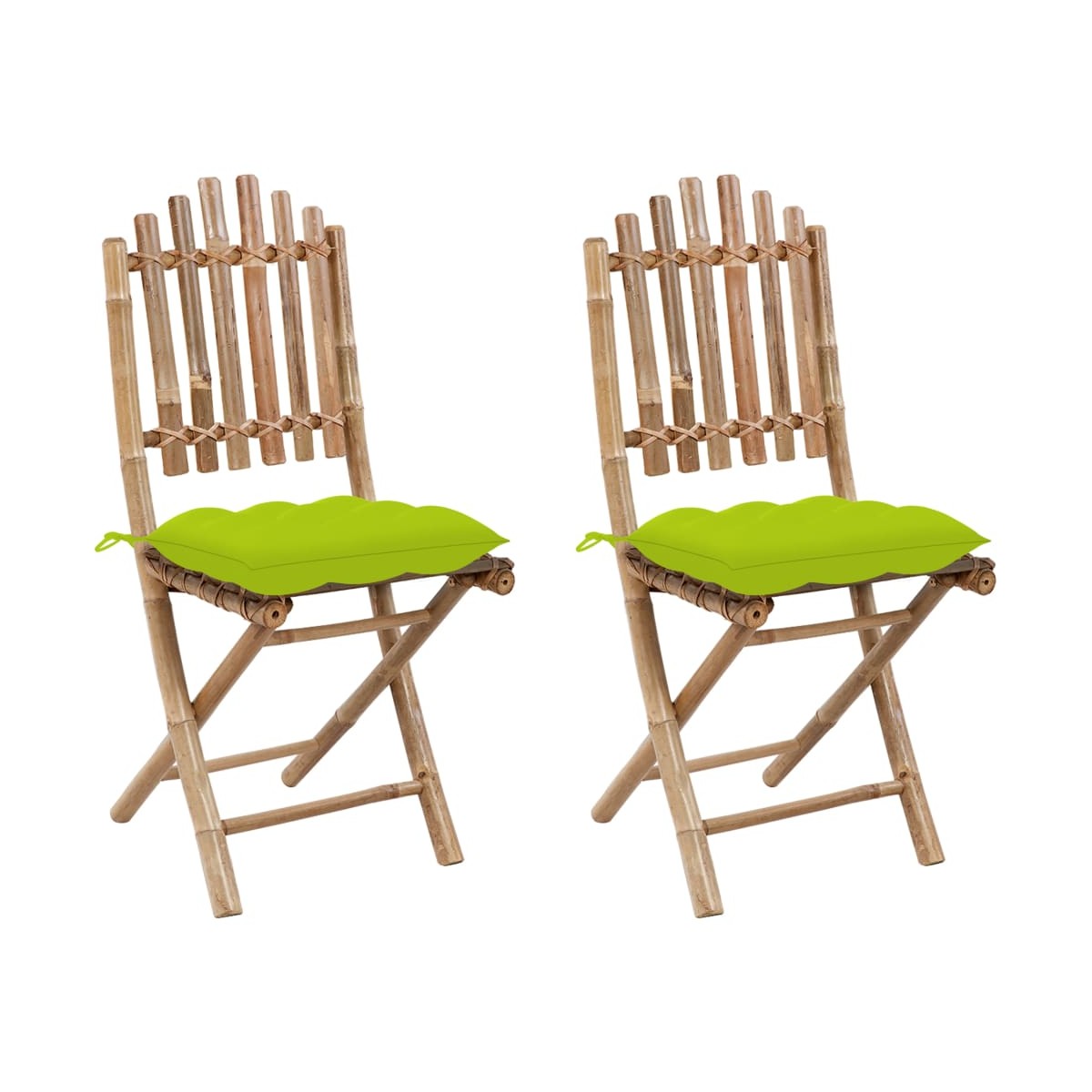 Este juego de 2 sillas de jardín con cojines será un elección genial para cenar al aire libre en el jardín o el patio. Hecha de bambú macizo, la silla de exterior es fuerte y duradera. También es resistente a la intemperie, impermeable y fácil de limpiar con un paño húmedo. La silla de comedor es pelgable, para ahorrar espacio cuando no se use. Además, los cojines incluidos proporcionan un plus de comodidad mientras descansas. Están hechos 100% de poliéster, por lo que son lo bastante resistentes y duraderos como para utilizarlos al aire libre. Cada cojín posee dos juegos de cuerdas para fijarlo firmemente sobre la silla. Nota: Para prolongar la vida útil de los muebles de exterior, te recomendamos que los limpies con regularidad y no los dejes al aire libre sin protección innecesariamente.Limpieza: Usa una solución de jabón suaveAlmacenamiento: Si es posible, guarda el producto en un lugar fresco y seco en el interior. Si el producto se almacena al aire libre, protégelo con una funda impermeable. Limpia y seca el exceso de agua o nieve de las superficies planas después de una lluvia o nevada. Permite la ventilación para evitar daños relacionados con la humedad.