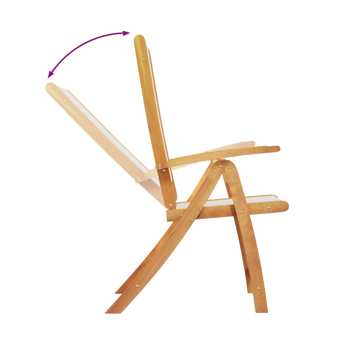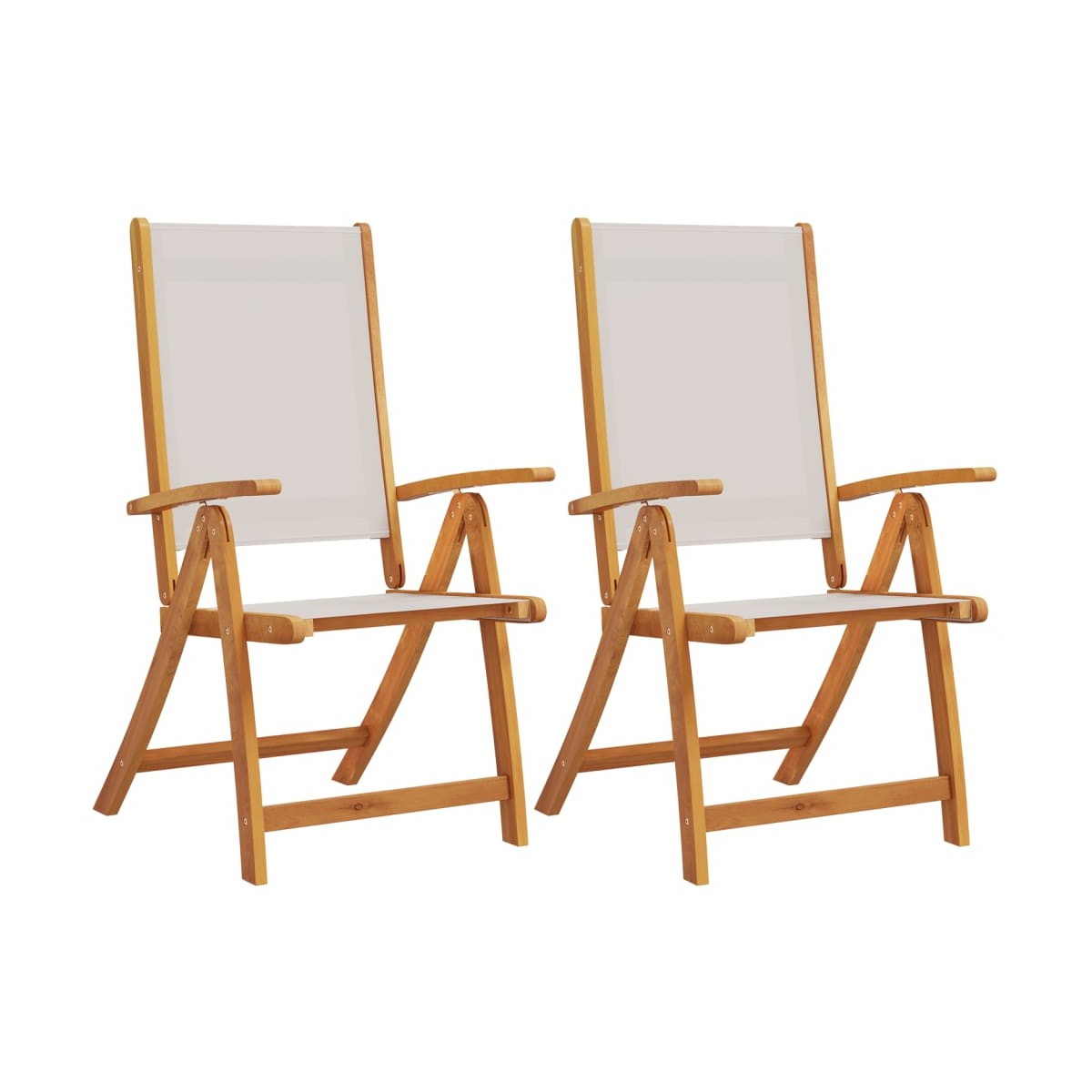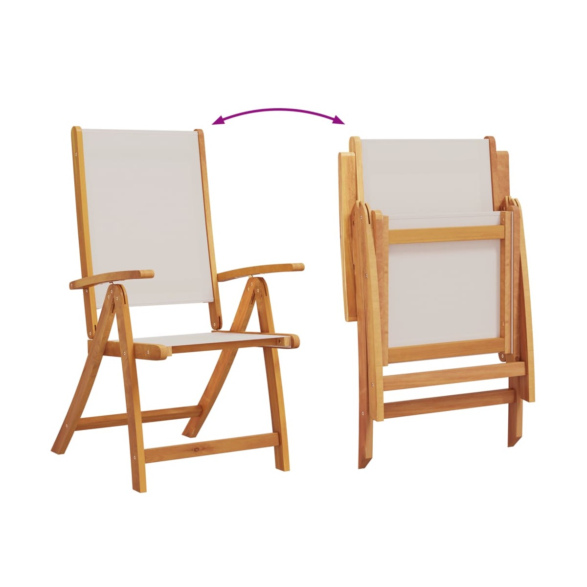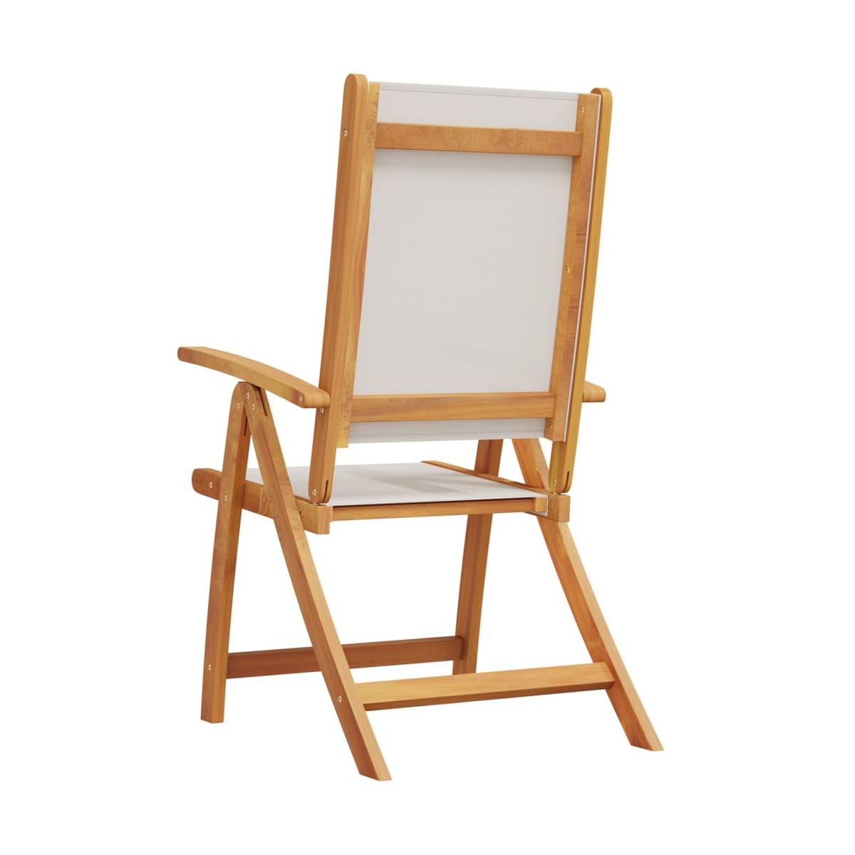 Estas sillas de jardín plegables serán un gran aporte para tu jardín, patio o terraza, permitiéndote disfrutar de un momento acogedor con tu familia o amigos. Robusta y estable: La madera maciza de acacia es conocida por su resistencia y durabilidad. Sus diversos colores y patrones de vetas únicos le dan una apariencia atractiva. Con buena estabilidad y resistencia a la intemperie, es ideal para fabricar muebles de interior y exterior.Duradero: El tejido textileno es apreciado por su durabilidad, resistencia al agua y a la decoloración, fácil mantenimiento y protección contra los rayos UV y el moho, lo que lo convierte en una opción ideal para muebles de exterior y estructuras de con toldo.Fácil de transportar y almacenar: La silla presenta un diseño plegable y compacto, lo que permite un fácil almacenamiento y portabilidad. Es una opción ideal para actividades al aire libre.Respaldo ajustable: La silla de jardín cuenta con un respaldo con 5 posiciones ajustables, con lo que puedes encontrar fácilmente la posición más cómoda y adecuada para relajarte. Información útil:Para asegurarte de que tus muebles de exterior se mantengan hermosos, recomendamos protegerlos con una funda impermeable.