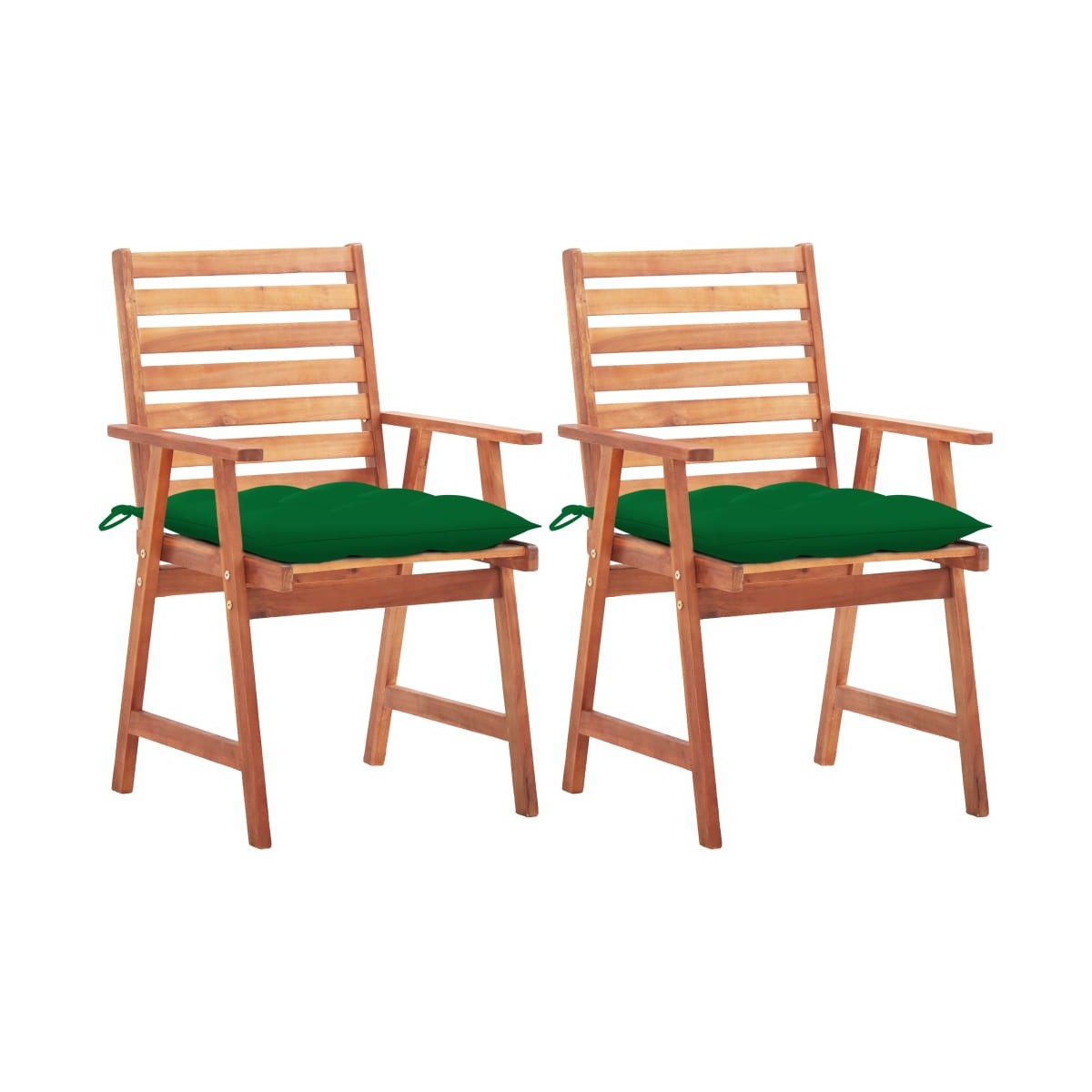 Este moderno juego de sillas de comedor de madera con cojines dará un toque de estilo natural a tu jardín, terraza o patio. Este juego de sillas de madera será una gran opción para cenar al aire libre. Estas sillas de jardín están hechas de madera maciza de acacia, una madera dura tropical, que es resistente a la intemperie y duradera para años de uso. La superficie con acabado de aceite es fácil de limpiar con un paño húmedo. El diseño de listones aportará un encanto rústico. Además, los cojines incluidos brindan mayor comodidad al sentarse. Está confeccionado en 100% poliéster que ha sido tratado para hacerlo impermeable. Cada cojín tiene dos juegos de cuerdas para fijarlo firmemente a la silla.