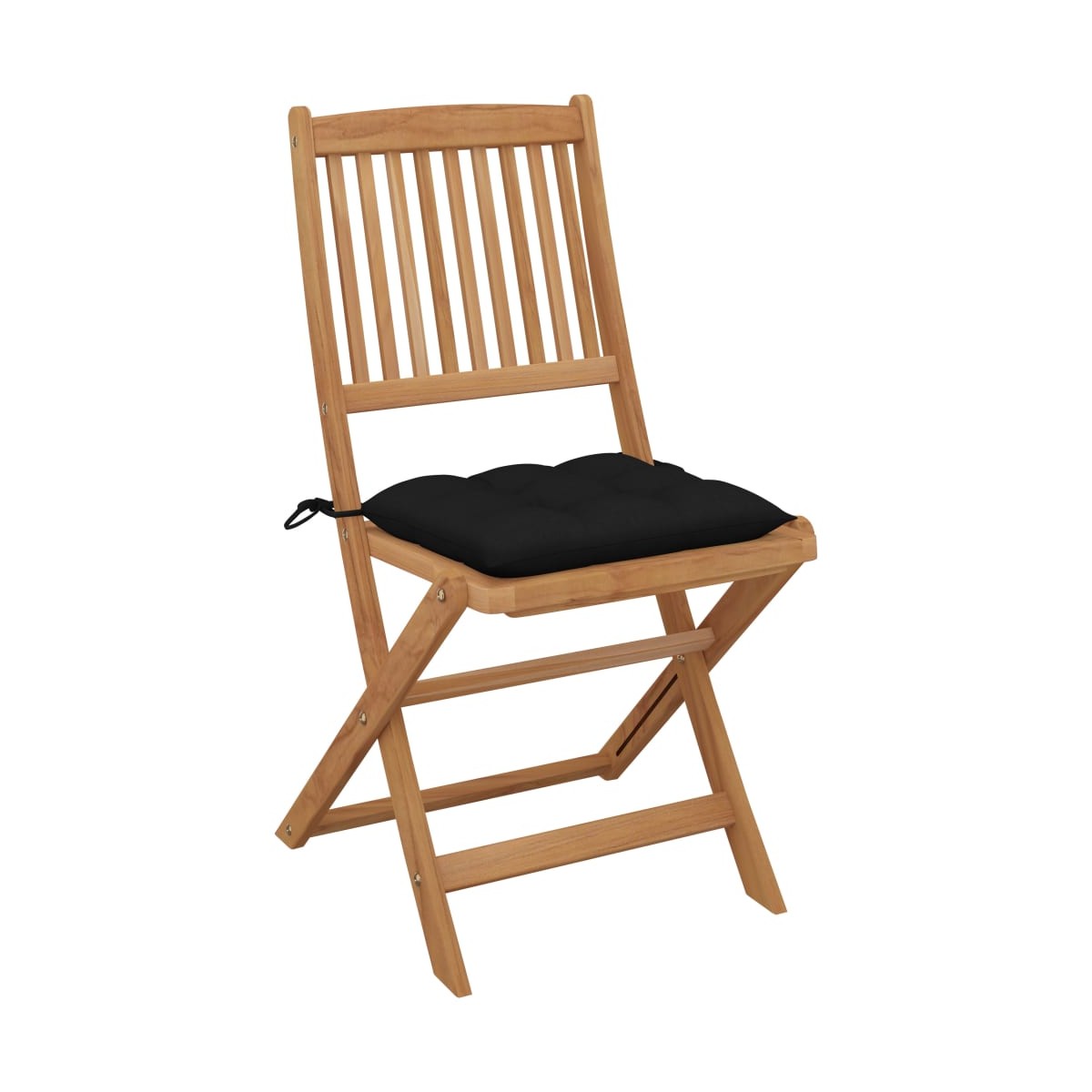 Estas sillas plegables de madera maciza de acacia con cojines proporcionan un lugar perfecto para relajarte y disfrutar del sol en el jardín o en el patio. Estas sillas de jardín están hechas de madera de acacia maciza, lo que las hace robustas y estables. La madera de acacia maciza tiene fuerza para soportar peso y es resistente al desgaste del tiempo. Por eso, estas sillas de jardín brindan años de relajación. Además, las sillas se pueden plegar para ahorrar espacio cuando no están en uso. Los cojines incluidos agregan comodidad extra. Cada cojín cuenta con dos juegos de cuerdas para fijarlo firmemente a la silla. Nota: Para prolongar la vida útil de los muebles de exterior, te recomendamos que los limpies con regularidad y no los dejes al aire libre sin protección innecesariamente.Limpieza: Usa una solución de jabón suaveAlmacenamiento: Si es posible, guarda el producto en un lugar fresco y seco en el interior. Si el producto se almacena al aire libre, protégelo con una funda impermeable. Limpia y seca el exceso de agua o nieve de las superficies planas después de una lluvia o nevada. Permite la ventilación para evitar daños relacionados con la humedad.