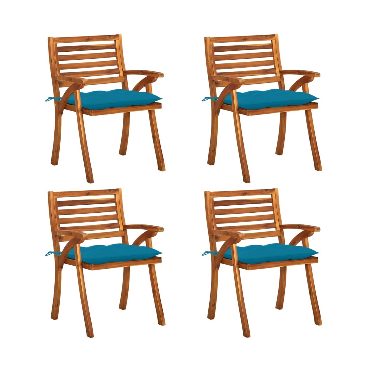 Este moderno juego de sillas de jardín de madera ha sido diseñado para ser un auténtico elemento llamativo en tu jardín, comedor o patio. Estas sillas de exterior está hecha de madera maciza de acacia, una madera dura con vetas densas. Estas sillas de hermoso diseño son estables, duraderas y llamativas. La superficie con acabado de aceite facilita la limpieza con un paño húmedo. Los reposabrazos añaden más comodidad al sentarse. Estos sillones, con un diseño de listones, son un aporte práctico y decorativo. Además, los cojines incluidos brindan mayor comodidad. Cada cojín tiene 2 juegos de cuerdas para fijarlo firmemente a la silla. Nota: Para prolongar la vida útil de los muebles de exterior, te recomendamos que los limpies con regularidad y no los dejes al aire libre sin protección innecesariamente.Limpieza: Usar una solución de jabón suaveAlmacenamiento: Si es posible, guarda el producto en un lugar fresco y seco en el interior. Si el producto se almacena al aire libre, protégelo con una funda impermeable. Limpia y seca el exceso de agua o nieve de las superficies planas después de una lluvia o nevada. Permite la ventilación para evitar daños relacionados con la humedad.