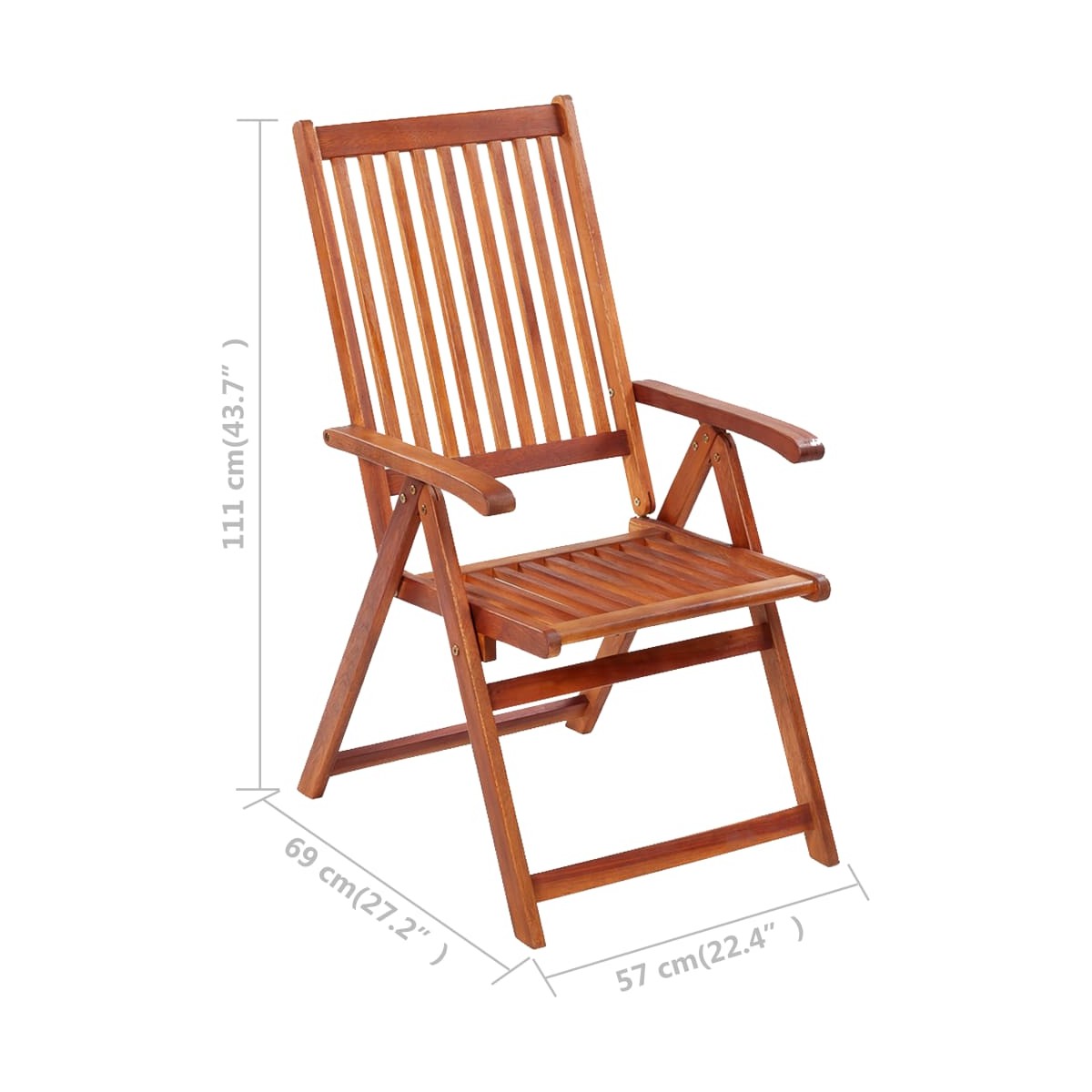 Este juego de sillas de jardín de madera con cojines ha sido diseñado para agregar un look vintage a cualquier cena en el jardín, la terraza o el patio. La silla plegable está hecha de madera maciza de acacia, una madera dura tropical, lo que la hace estable y duradera. La superficie con acabado de aceite es fácil de limpiar con un paño húmedo. La silla de comedor se puede ajustar en 5 posiciones, para brindarte una comodidad óptima al sentarte. También se puede plegar para ahorrar espacio cuando no la uses. Además, los cojines incluidos proporcionan mayor comodidad mientras descansas o cenas. Cada cojín cuenta con dos juegos de cuerdas en ambos lados y una correa elástica detrás del respaldo para fijarlo firmemente a la silla. La entrega incluye el hardware amarillo galvanizado.