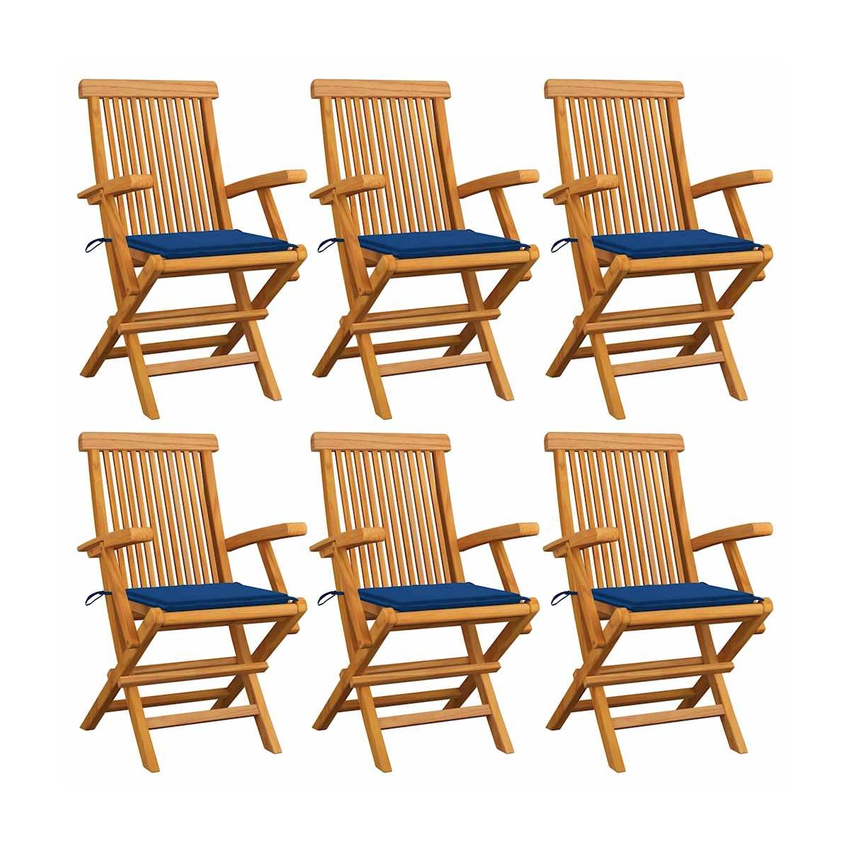 Este juego de sillas de jardín de madera consta de 6 unidades y está destinado a ser un gran aporte para el jardín, la terraza o el patio. Podrás relajarte y charlar con familiares y amigos o disfrutar del buen tiempo. Hecha con madera dura de teca muy duradera, este mueble de teca ha sido curado, secado en horno y luego lijado finamente para darle una apariencia muy suave. La madera de teca es conocida por su excepcional resistencia a la fuerza y al clima, por lo que es mucho más adecuada para muebles de jardín que cualquier otro tipo de madera. La madera de teca es la elección perfecta si deseas adquirir un mueble de jardín duradero. La superficie lijada se limpia fácilmente con un paño húmedo. Además, estas sillas de jardín son ligeras, lo que las hace totalmente flexibles y fáciles de mover. Si no las utilizas, las sillas de madera pueden plegarse para ahorrar espacio. Asimismo, los cojines de asiento incluidos refuerzan la comodidad del asiento.