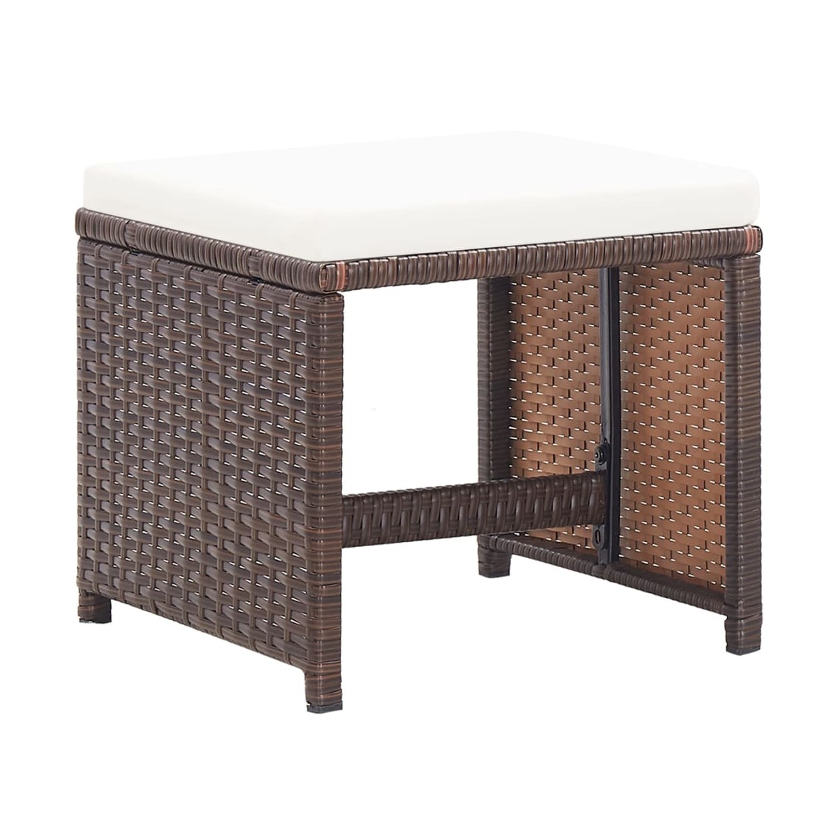 Estos taburetes de jardín son un complemento perfecto para tu jardín, patio o espacio al aire libre. Material duradero: El ratán PE, también conocido como ratán sintético, es resistente a la intemperie y fácil de limpiar. La parte exterior se mantiene hermosa durante mucho tiempo. Es más económico que otros materiales, además de ofrecer una gran calidad, comodidad y aspecto estético.Estructura robusta: La estructura de acero con recubrimiento en polvo del reposapiés garantiza robustez y estabilidad.Asientos cómodos: Los cojines acolchados y extraíbles son muy cómodos y refuerzan la comodidad del asiento. Nota:Para asegurarte de que tus muebles de exterior se mantengan hermosos, recomendamos protegerlos con una funda impermeable.