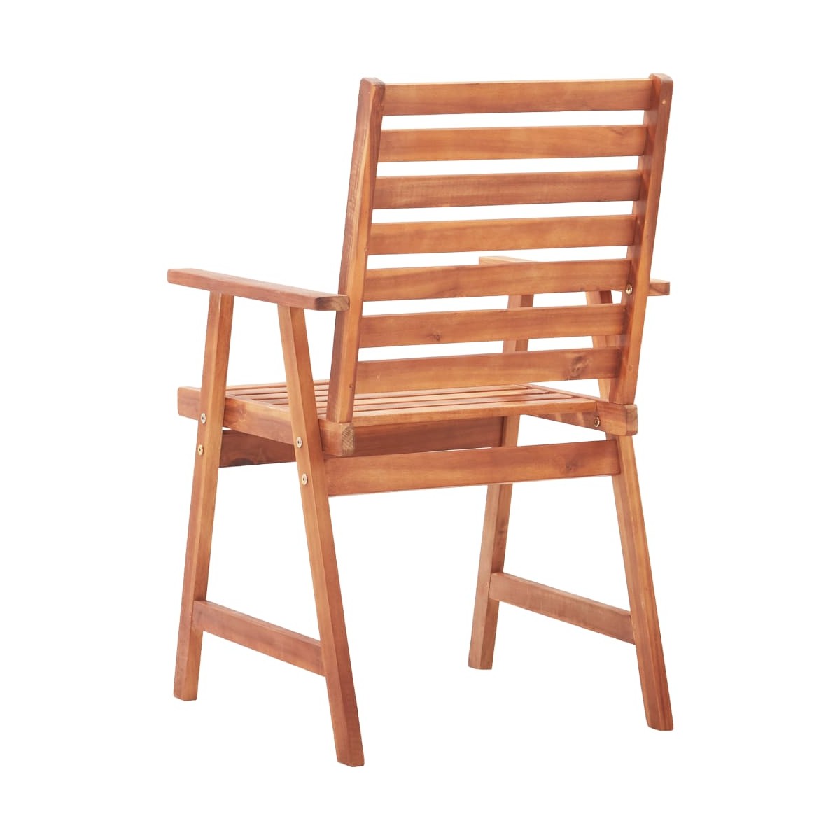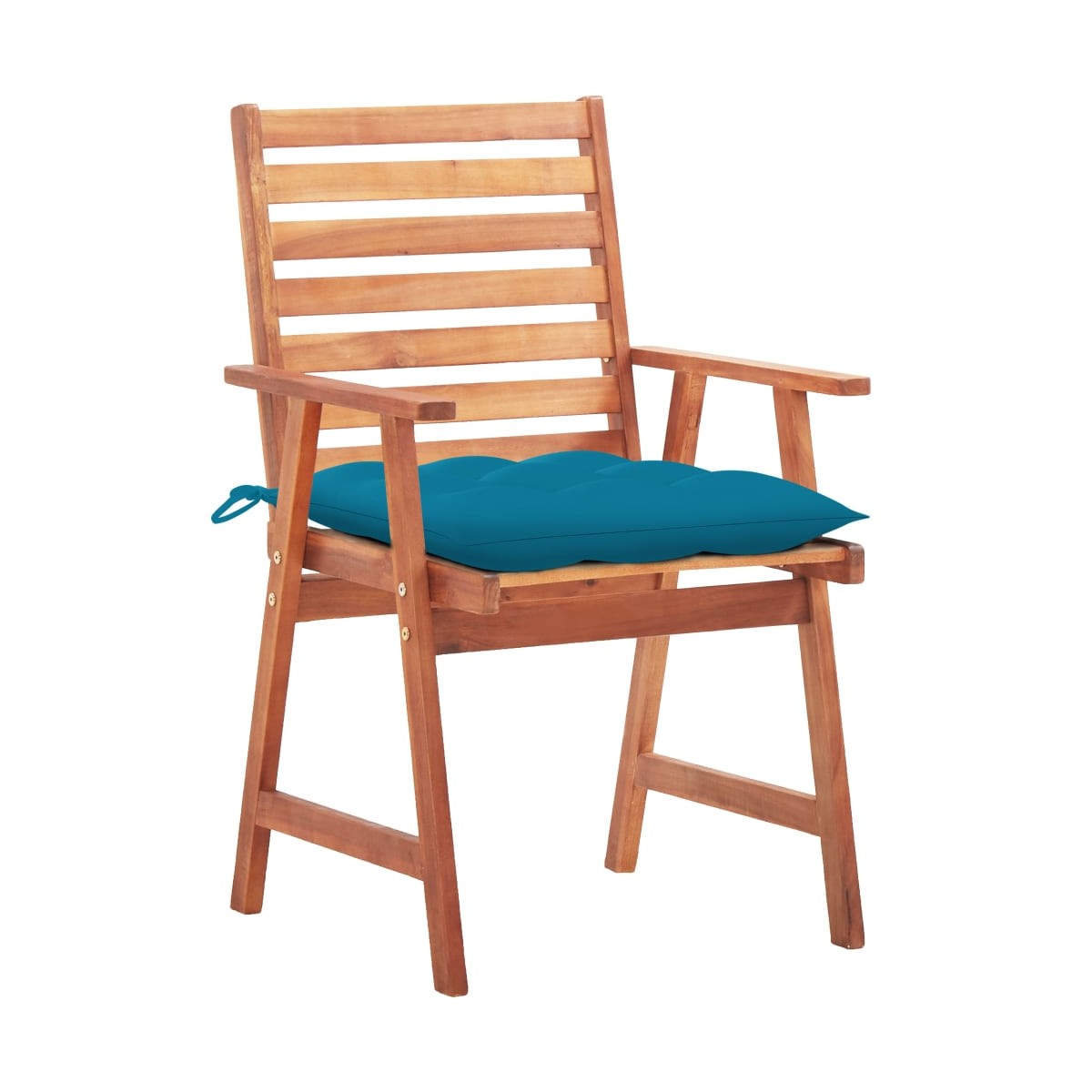 Este moderno juego de sillas de comedor de madera con cojines dará un toque de estilo natural a tu jardín, terraza o patio. Este juego de sillas de madera será una gran opción para cenar al aire libre. Estas sillas de jardín están hechas de madera maciza de acacia, una madera dura tropical, que es resistente a la intemperie y duradera para años de uso. La superficie con acabado de aceite es fácil de limpiar con un paño húmedo. El diseño de listones aportará un encanto rústico. Además, los cojines incluidos brindan mayor comodidad al sentarse. Está confeccionado en 100% poliéster que ha sido tratado para hacerlo impermeable. Cada cojín tiene dos juegos de cuerdas para fijarlo firmemente a la silla.