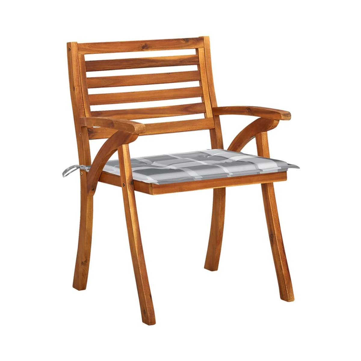 Este moderno juego de sillas de jardín de madera ha sido diseñado para ser un auténtico elemento llamativo en tu jardín, comedor o patio. Estas sillas de exterior está hecha de madera maciza de acacia, una madera dura con vetas densas. Estas sillas de hermoso diseño son estables, duraderas y llamativas. La superficie con acabado de aceite facilita la limpieza con un paño húmedo. Los reposabrazos añaden más comodidad al sentarse. Estos sillones, con un diseño de listones, son un aporte práctico y decorativo. Además, los cojines incluidos brindan mayor comodidad. Cada cojín tiene 2 juegos de cuerdas para fijarlo firmemente a la silla. Nota: Para prolongar la vida útil de los muebles de exterior, te recomendamos que los limpies con regularidad y no los dejes al aire libre sin protección innecesariamente.Limpieza: Usar una solución de jabón suaveAlmacenamiento: Si es posible, guarda el producto en un lugar fresco y seco en el interior. Si el producto se almacena al aire libre, protégelo con una funda impermeable. Limpia y seca el exceso de agua o nieve de las superficies planas después de una lluvia o nevada. Permite la ventilación para evitar daños relacionados con la humedad.