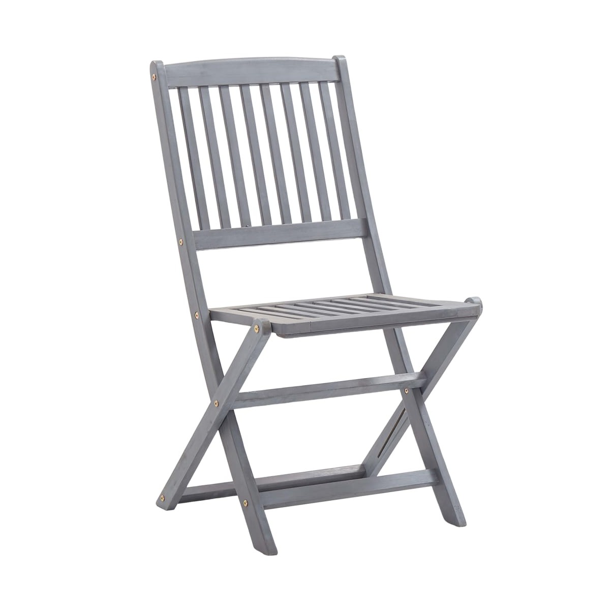 Este moderno juego de sillas de comedor de madera con cojines da un toque de estilo natural al jardín, la terraza o el patio. Este juego de sillas plegables es una gran opción para comer. Estas sillas de comedor están hechas de madera maciza de acacia, una madera dura tropical, por lo que son resistentes a la intemperie y muy duraderas. La madera maciza de acacia posee la fuerza para soportar pesos y para aguantar el desgaste y el paso del tiempo. La superficie en gris deslavado se limpia fácilmente con un paño húmedo. Las sillas se pueden plegar para ahorrar espacio cuando no se usen. Además, los cojines incluidos proporcionan un plus de comodidad mientras descansas o comes. Cada cojín cuenta con dos juegos de cuerdas para fijarlo firmemente en la silla. Nota: Para prolongar la vida útil de los muebles de exterior, te recomendamos que los limpies con regularidad y no los dejes al aire libre sin protección innecesariamente.Limpieza: Usa una solución de jabón suaveAlmacenamiento: Si es posible, guarda el producto en un lugar fresco y seco en el interior. Si el producto se almacena al aire libre, protégelo con una funda impermeable. Limpia y seca el exceso de agua o nieve de las superficies planas después de una lluvia o nevada. Permite la ventilación para evitar daños relacionados con la humedad.