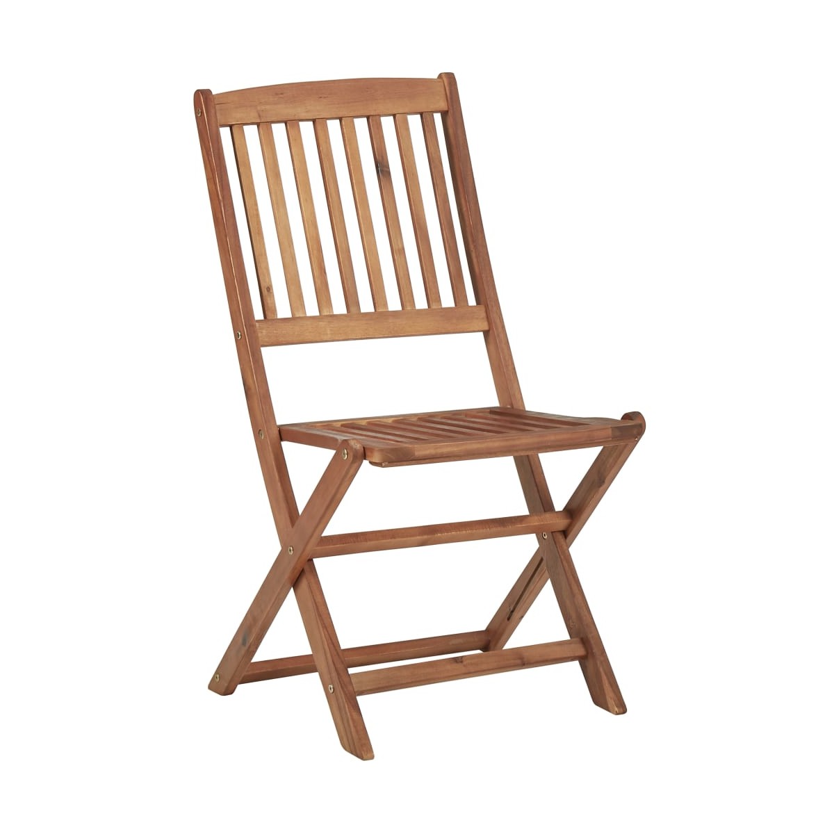 Estas sillas plegables de madera maciza de acacia con cojines proporcionan un lugar perfecto para relajarte y disfrutar del sol en el jardín o en el patio. Estas sillas de jardín están hechas de madera de acacia maciza, lo que las hace robustas y estables. La madera de acacia maciza tiene fuerza para soportar peso y es resistente al desgaste del tiempo. Por eso, estas sillas de jardín brindan años de relajación. Además, las sillas se pueden plegar para ahorrar espacio cuando no están en uso. Los cojines incluidos agregan comodidad extra. Cada cojín cuenta con dos juegos de cuerdas para fijarlo firmemente a la silla. Nota: Para prolongar la vida útil de los muebles de exterior, te recomendamos que los limpies con regularidad y no los dejes al aire libre sin protección innecesariamente.Limpieza: Usa una solución de jabón suaveAlmacenamiento: Si es posible, guarda el producto en un lugar fresco y seco en el interior. Si el producto se almacena al aire libre, protégelo con una funda impermeable. Limpia y seca el exceso de agua o nieve de las superficies planas después de una lluvia o nevada. Permite la ventilación para evitar daños relacionados con la humedad.