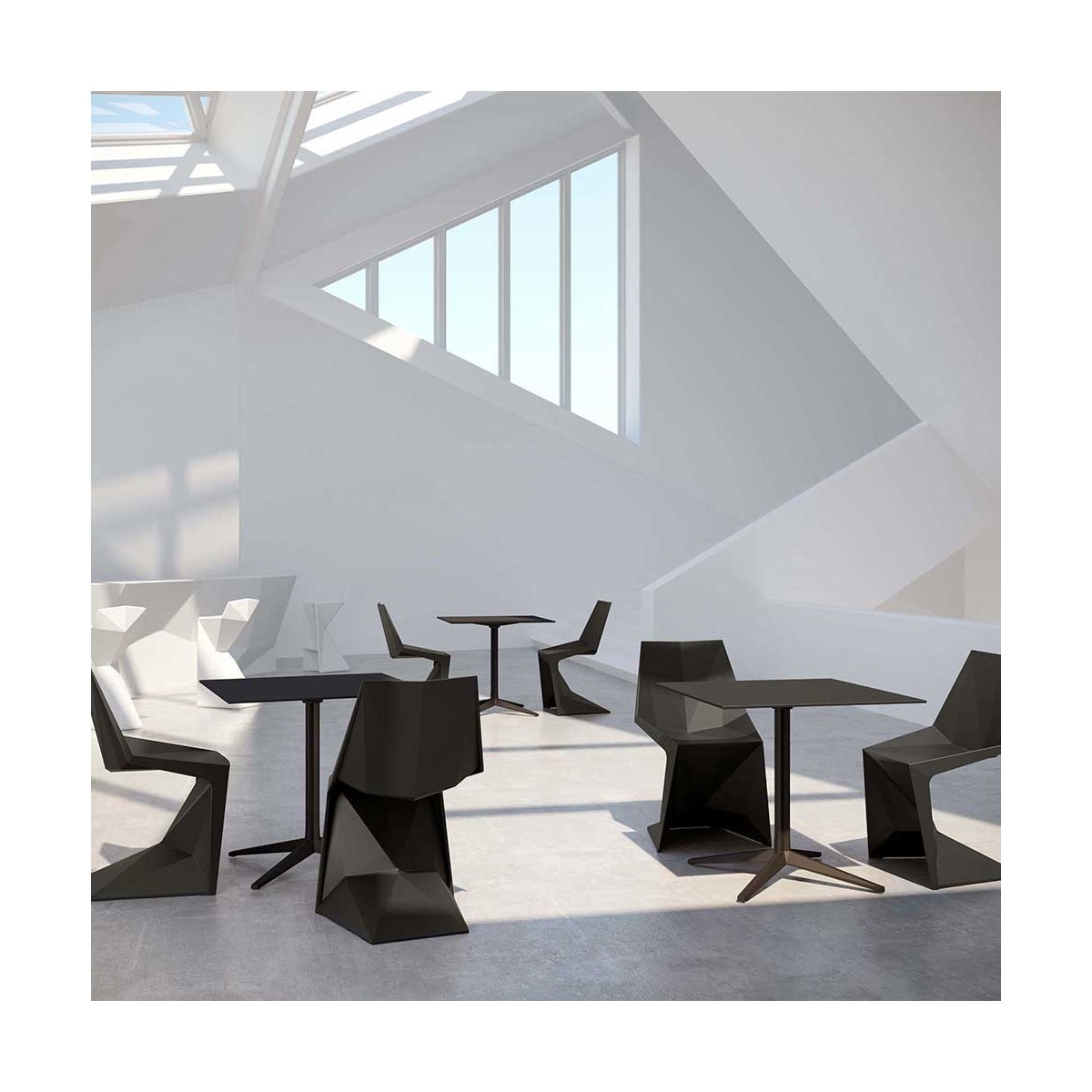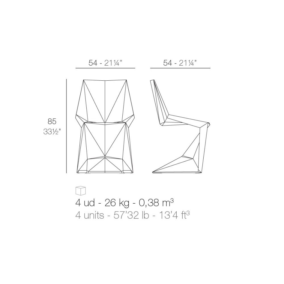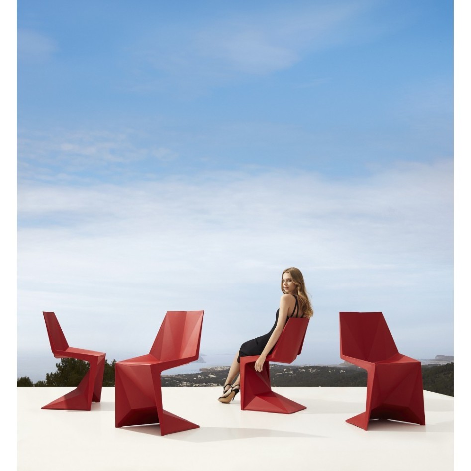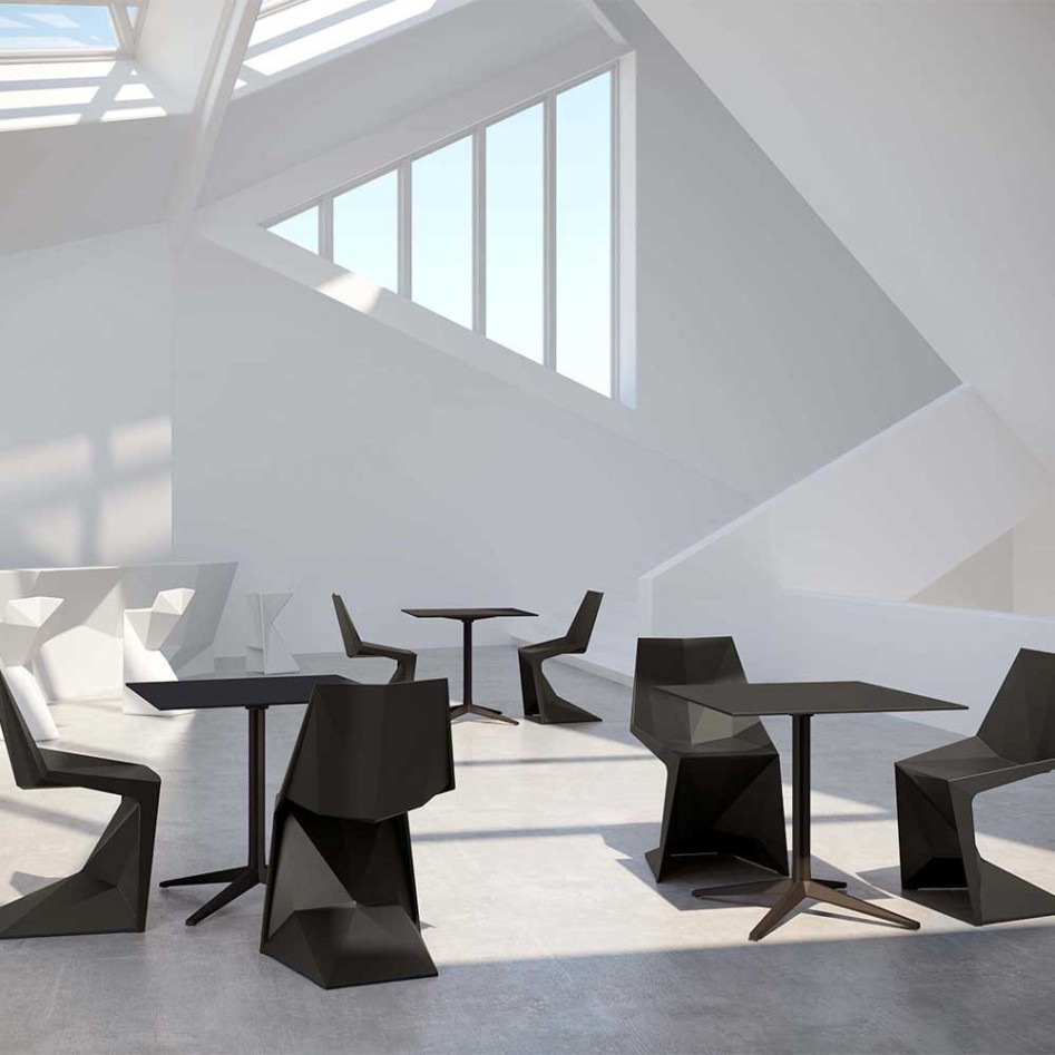 Ahora esta colección la conforman la silla y el sillón. Inspirada en una pieza anterior de Vondom, la silla Vertex. Cuenta con una forma estructural única, angulada y facetada, que es posible gracias a su despliegue de moldeo por inyección. El peso se distribuye uniformemente debido a su forma inteligente.