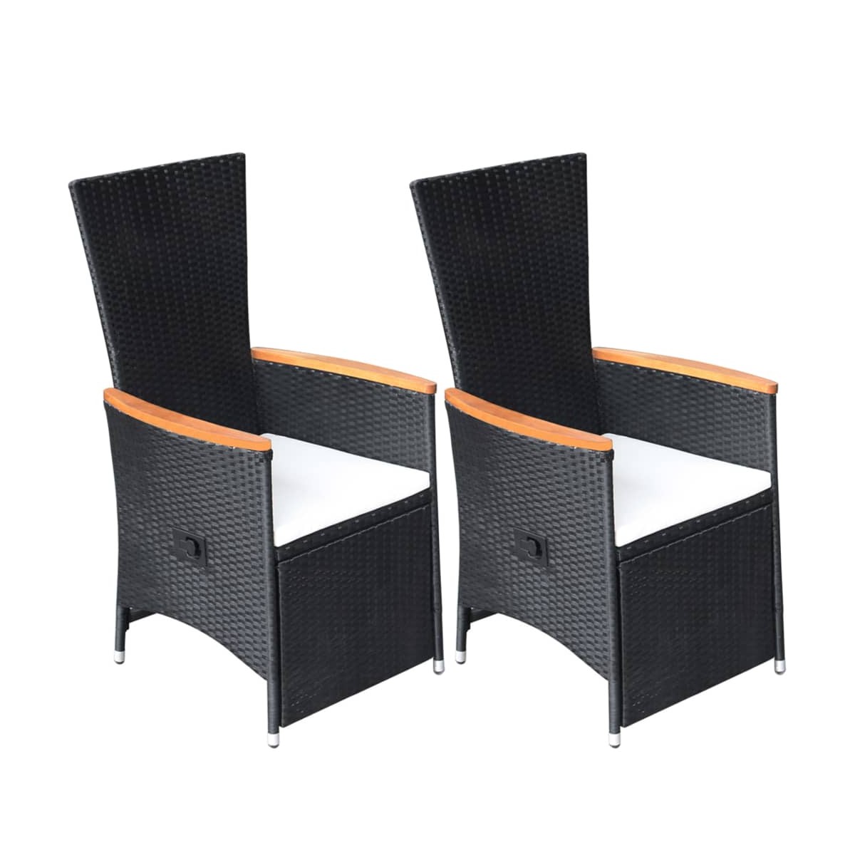 Este conjunto de sillas reclinables de jardín, hechas de ratán, tiene un elegante diseño y se convertirá en el centro de atención de tu jardín, patio o balcón. Las sillas están hechas de ratán PE, resistente a la intemperie e impermeable, y son fáciles de limpiar. La estructura de acero con revestimiento de polvo hace que sean muy resistentes y duraderas. Los reposabrazos están hechos de madera de acacia, una madera dura tropical que es resistente ante la intemperie. Tocando el botón del lateral, podrá reclinar el respaldo y elevar el reposapiés al mismo tiempo, para encontrar la posición tumbada más cómoda. Gracias a su construcción ligera, las sillas se pueden mover fácilmente. Los cojines de asiento, hechos de poliéster repelente al agua, son gruesos, suaves y rellenos de espuma, por lo que son muy cómodos. Las fundas de cojín con cremalleras se pueden extraer y lavar fácilmente. La entrega incluye 2 sillas de comedor reclinables para jardín y 2 cojines de asiento. Nota: Recomendamos cubrir las sillas en caso de lluvia, nieve o heladas.