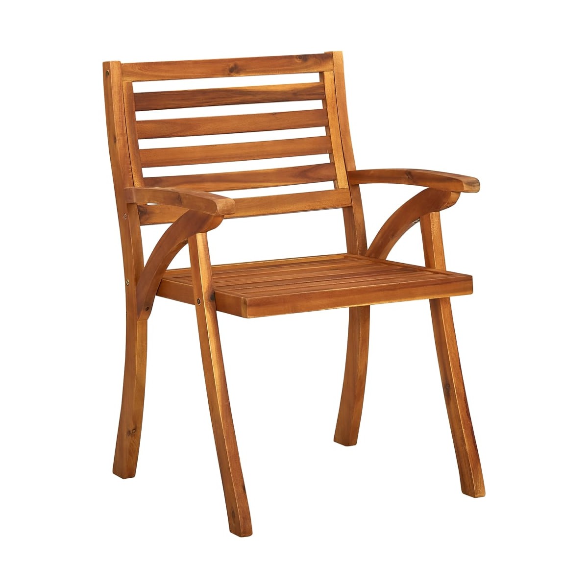 Este moderno juego de sillas de jardín de madera ha sido diseñado para ser un auténtico elemento llamativo en tu jardín, comedor o patio. Esta silla de exterior está hecha de madera maciza de acacia, una madera dura con vetas densas. Estas bonitas sillas son estables, duraderas y atractivas. La superficie con acabado al aceite facilita su limpieza con tan solo un paño húmedo. Los reposabrazos refuerzan su comodidad al sentarte. Estas sillas con reposabrazos y un diseño de listones son un aporte práctico y decorativo. Nota: Para prolongar la vida útil de los muebles de exterior, te recomendamos que los limpies con regularidad y no los dejes al aire libre sin protección innecesariamente.Limpieza: Usar una solución de jabón suaveAlmacenamiento: Si es posible, guarda el producto en un lugar fresco y seco en el interior. Si el producto se almacena al aire libre, protégelo con una funda impermeable. Limpia y seca el exceso de agua o nieve de las superficies planas después de una lluvia o nevada. Permite la ventilación para evitar daños relacionados con la humedad.