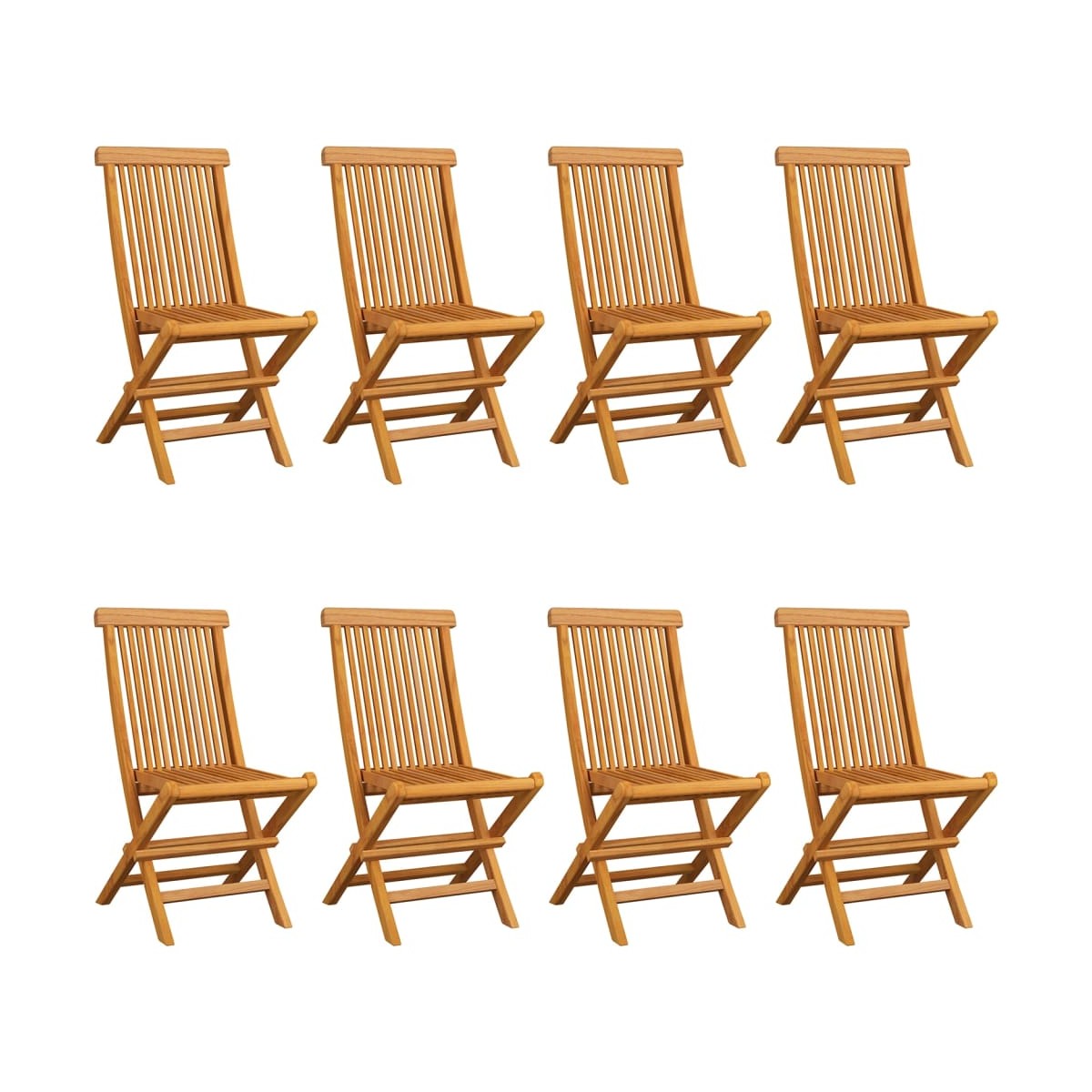 Estas sillas de jardín plegables de madera, con un diseño sencillo pero elegante, están diseñadas para brindar una cómoda experiencia de asiento. Construidas con madera maciza de teca muy duradera, estos muebles de teca han sido secados al horno y lijados finamente para darles una apariencia muy lisa. La madera de teca es conocida por su excepcional robustez y resistencia a la intemperie, lo que la hace mucho más adecuada para muebles de jardín que cualquier otro tipo de madera. La madera de teca es la elección perfecta si quieres comprar un mueble de jardín duradero. La superficie lijada es fácil de limpiar con un paño húmedo. Estas sillas de comedor para jardín también son ligeras, lo que las hace completamente flexibles y fáciles de mover. Las sillas de exterior se pueden plegar fácilmente cuando no se usen. Además, los cojines de asiento acolchados también brindan mayor comodidad al sentarse. Nota: Para prolongar la vida útil de los muebles de exterior, te recomendamos que los limpies con regularidad y no los dejes al aire libre sin protección innecesariamente.Limpieza: Usa una solución de jabón suaveAlmacenamiento: Si es posible, guarda el producto en un lugar fresco y seco en el interior. Si el producto se almacena al aire libre, protégelo con una funda impermeable. Limpia y seca el exceso de agua o nieve de las superficies planas después de una lluvia o nevada. Permite la ventilación para evitar daños relacionados con la humedad.