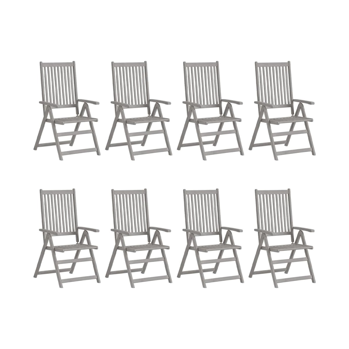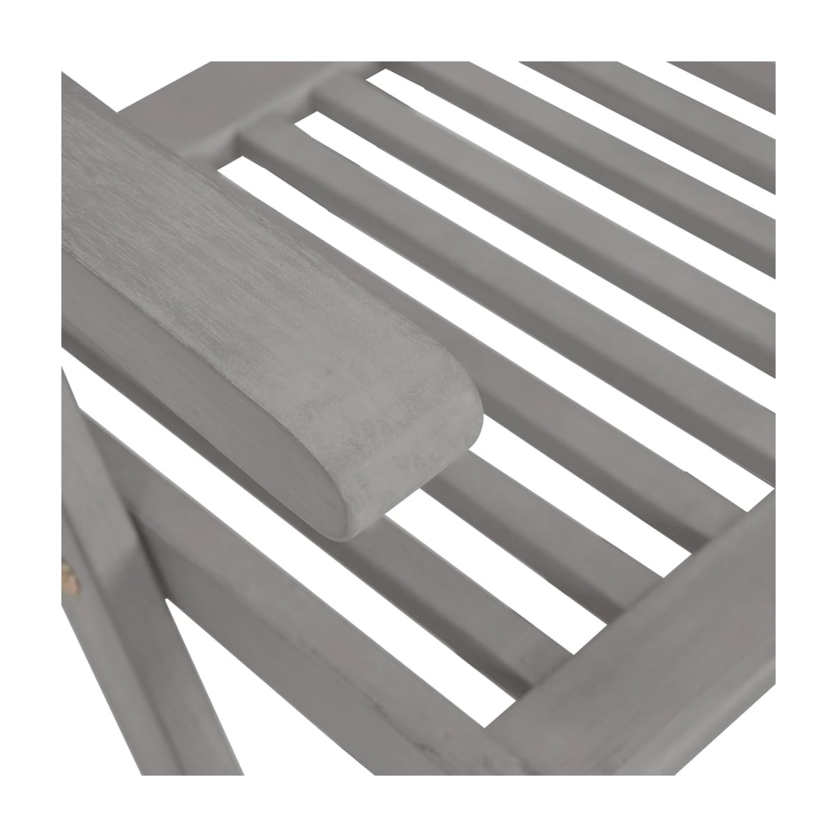 ¡Este moderno juego de sillas reclinables de jardín eleva la comodidad de tu espacio al aire libre! Estos sillones están hechos de madera maciza de acacia con acabado lavado gris, una madera dura con vetas densas. Estas sillas de jardín con un bonito diseño son estables, duradera y llamativas. El respaldo de la silla se puede ajustar en 5 configuraciones de reclinación, por lo que siempre puedes establecer la posición más cómoda según tus preferencias. Estas sillas son perfectas para cenar con tu familia o simplemente disfrutar del buen tiempo en tu jardín. Además, los cojines incluidos brindan mayor comodidad. Cada cojín tiene 1 correa elástica y 2 juegos de cuerdas para fijarlo firmemente a la silla. Nota: Para prolongar la vida útil de los muebles de exterior, te recomendamos que los limpies con regularidad y no los dejes al aire libre sin protección innecesariamente.Limpieza: Usar una solución de jabón suaveAlmacenamiento: Si es posible, guarda el producto en un lugar fresco y seco en el interior. Si el producto se almacena al aire libre, protégelo con una funda impermeable. Limpia y seca el exceso de agua o nieve de las superficies planas después de una lluvia o nevada. Permite la ventilación para evitar daños relacionados con la humedad.