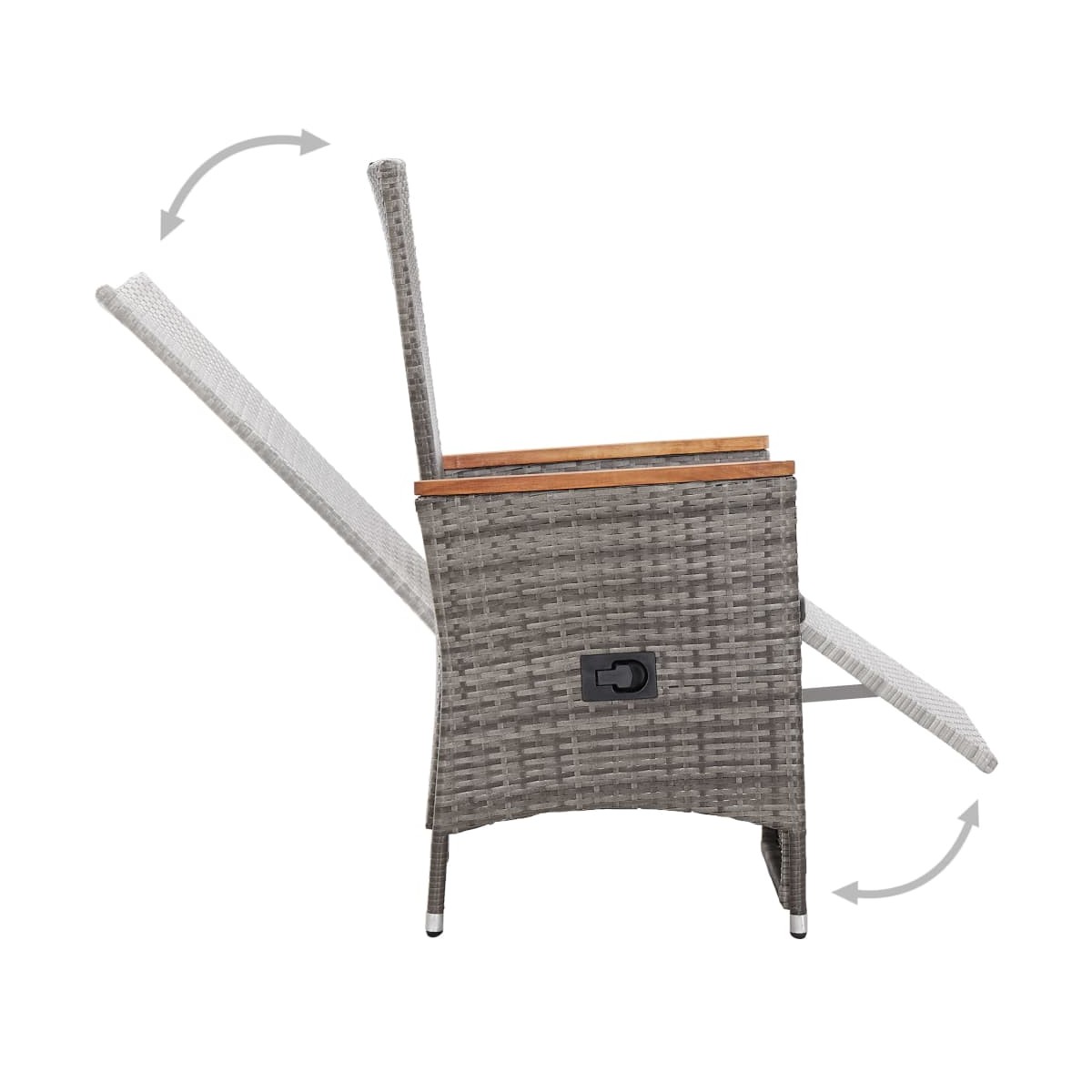 ¡Nuestras elegantes sillas reclinables para jardín son de ratán sintético y se convertirán en el centro de atención de tu jardín o patio! Estas sillas de comedor posee un diseño elegante y contemporáneo y serán una gran elección para cenar al aire libre o para relajarte en el jardín. Hecho de ratán PE resistente al agua y a la intemperie, el asiento de exterior es fácil de limpiar, resistente y adecuado para el uso diario. Las estructuras de acero con recubrimiento en polvo las hacen fuertes y robustas. Los reposabrazos son de madera de acacia, una madera dura tropical que aporta un toque rústico. Gracias al diseño regulable y al mecanismo de elevación por gas, el respaldo y el reposapiés pueden ajustarse para acomodarse a tu postura. Al tocar el botón del lateral, el respaldo se reclina y el reposapiés se mueve a la vez, para encontrar una postura cómoda. Debido a su ligereza, las sillas reclinables son fáciles de mover. Los cojines de asiento gruesos, suaves y rellenos de espuma, son muy cómodos y están hechos de poliéster hidrófugo. Las fundas de cojín con cremalleras se pueden quitar y lavar fácilmente. Nota: Se recomienda cubrir el set en caso de lluvia, nieve y heladas.