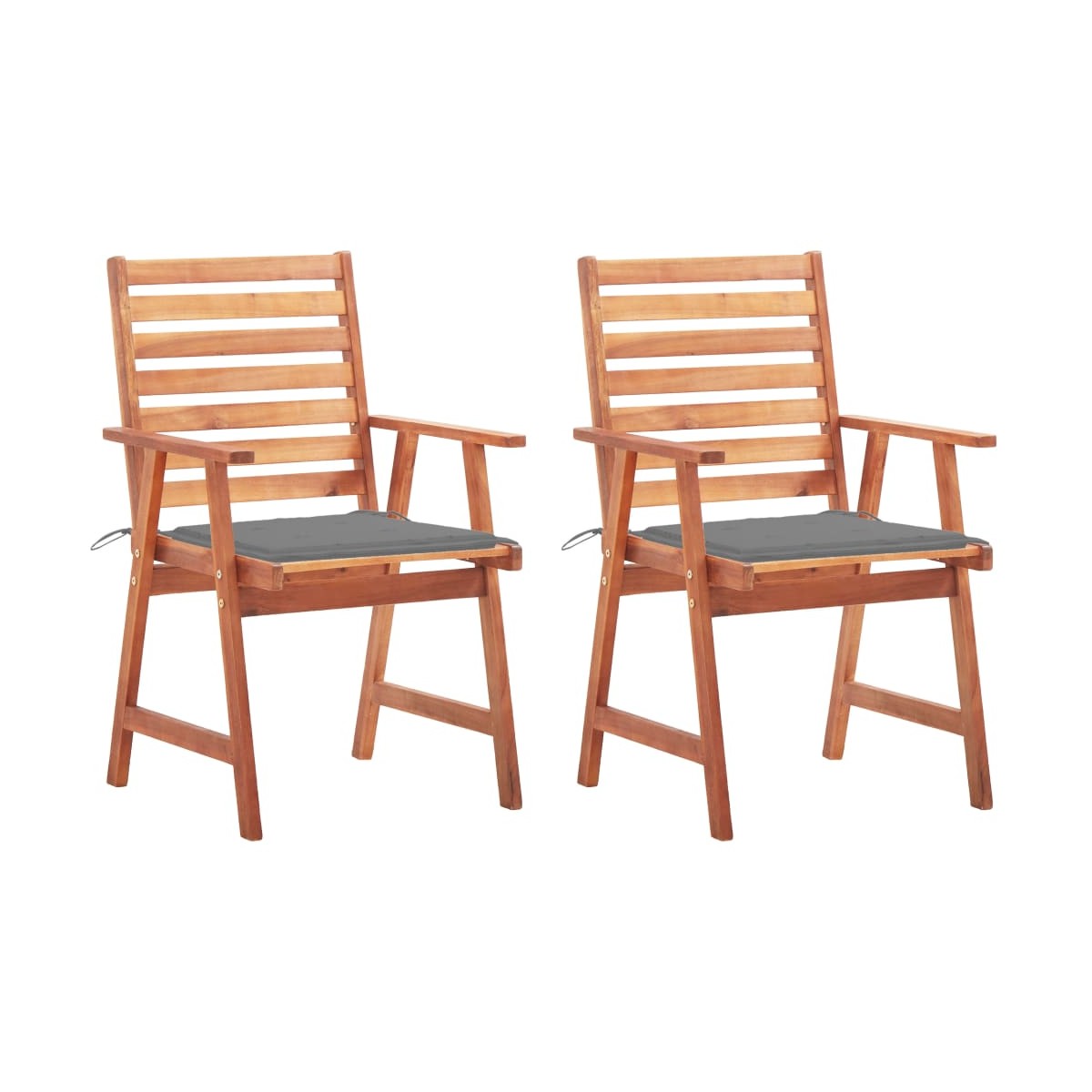 Este moderno juego de sillas de comedor de madera con cojines dará un toque de estilo natural a tu jardín, terraza o patio. Este juego de sillas de madera será una gran opción para cenar al aire libre. Estas sillas de jardín están hechas de madera maciza de acacia, una madera dura tropical, que es resistente a la intemperie y duradera para años de uso. La superficie con acabado de aceite es fácil de limpiar con un paño húmedo. El diseño de listones aportará un encanto rústico. Además, los cojines incluidos brindan mayor comodidad al sentarse. Está confeccionado en 100% poliéster que ha sido tratado para hacerlo impermeable. Cada cojín tiene dos juegos de cuerdas para fijarlo firmemente a la silla.