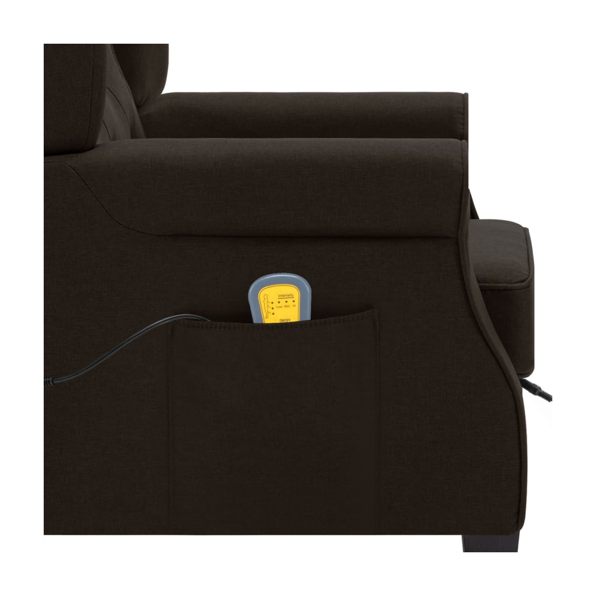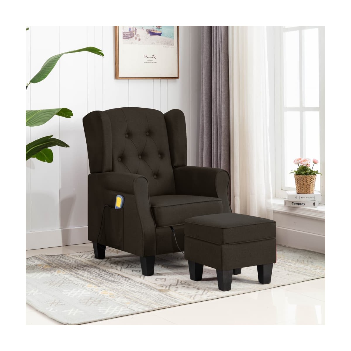 El sillón de masaje con un taburete reposapiés le da un look moderno a la decoración de tu hogar y es perfecto para el salón. El sillón de masaje eléctrico está hecho de tela y relleno de espuma, lo que lo hace fuerte y suave para sentarse. Las patas de madera ofrecen estabilidad adicional para este sillón. Este sillón de masaje cuenta con un respaldo de ala alta y una amortiguación profunda que brinda una gran comodidad. El sillón de masaje cuenta con 4 puntos de masaje para la espalda y el asiento, y el reposapiés tiene 2 puntos de masaje para las piernas. El mando a distancia incluido permite elegir diferentes programas de masaje. El sillón de masaje de TV también está equipado con un bolsillo lateral para el mando a distancia. El reposapiés está relleno de algodón PP, y su parte superior es desmontable. Nota: El producto tiene un conector USB, pero la fuente de alimentación USB de 5V certificada no está incluida.