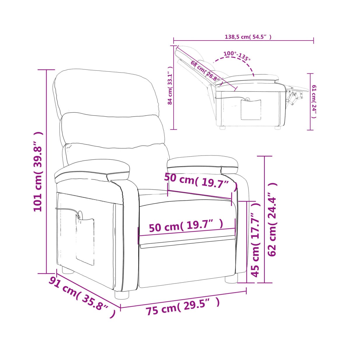 ¡Siéntate y descansa en este comodísimo sillón de masaje! Función de reclinado manual: El sillón reclinable está especialmente diseñado con 3 posiciones de reclinado para que puedas ajustar el respaldo y el reposapiés a mano según lo que quieras.Función de vibración: Los 6 puntos de masaje te harán disfrutar de un masaje mejor enfocado. Además, el mando incluido te permite elegir diferentes programas de masaje. La función de masaje funciona a través del conector USB que requiere una fuente de alimentación USB de 5 V certificada (no incluida).Cómodo asiento: El asiento acolchado, el respaldo y los amplios reposabrazos cubiertos de tela proporcionan una sensación cómoda y acogedora, para que estés de maravilla mientras te sientas. La tela posee un aspecto sencillo y limpio, y es transpirable y duradera.Estructura maciza y estable: La estructura, hecha de madera y metal, proporciona una estructura y una estabilidad fuertes. Este sillón reclinables es cómodo y duradero.
