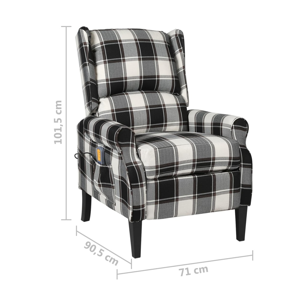 Este sillón reclinable de masaje especialmente diseñado es una excelente solución de asiento y un aporte perfecto para tu salón. El sillón de masaje eléctrico está fabricado en tela y sostenido por pies de madera, lo que lo hace fuerte y suave para sentarse. El sillón reclinable de masaje tiene 6 puntos de masaje para la espalda, el asiento y las piernas. El mando incluido te permite elegir diferentes programas de masaje. Asimismo, el respaldo se puede regular hacia detrás y el reposapiés, hacia arriba. Esta posición te permite tumbarte de forma cómoda. El sillón reclinable y eléctrico de masaje también está equipado con un bolsillo lateral para el mando. Nota: El producto tiene un conector USB, pero la fuente de alimentación USB de 5V certificada no está incluida.