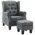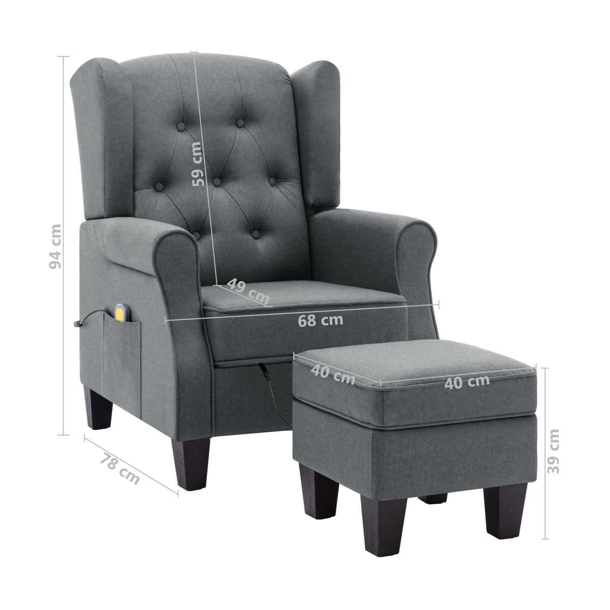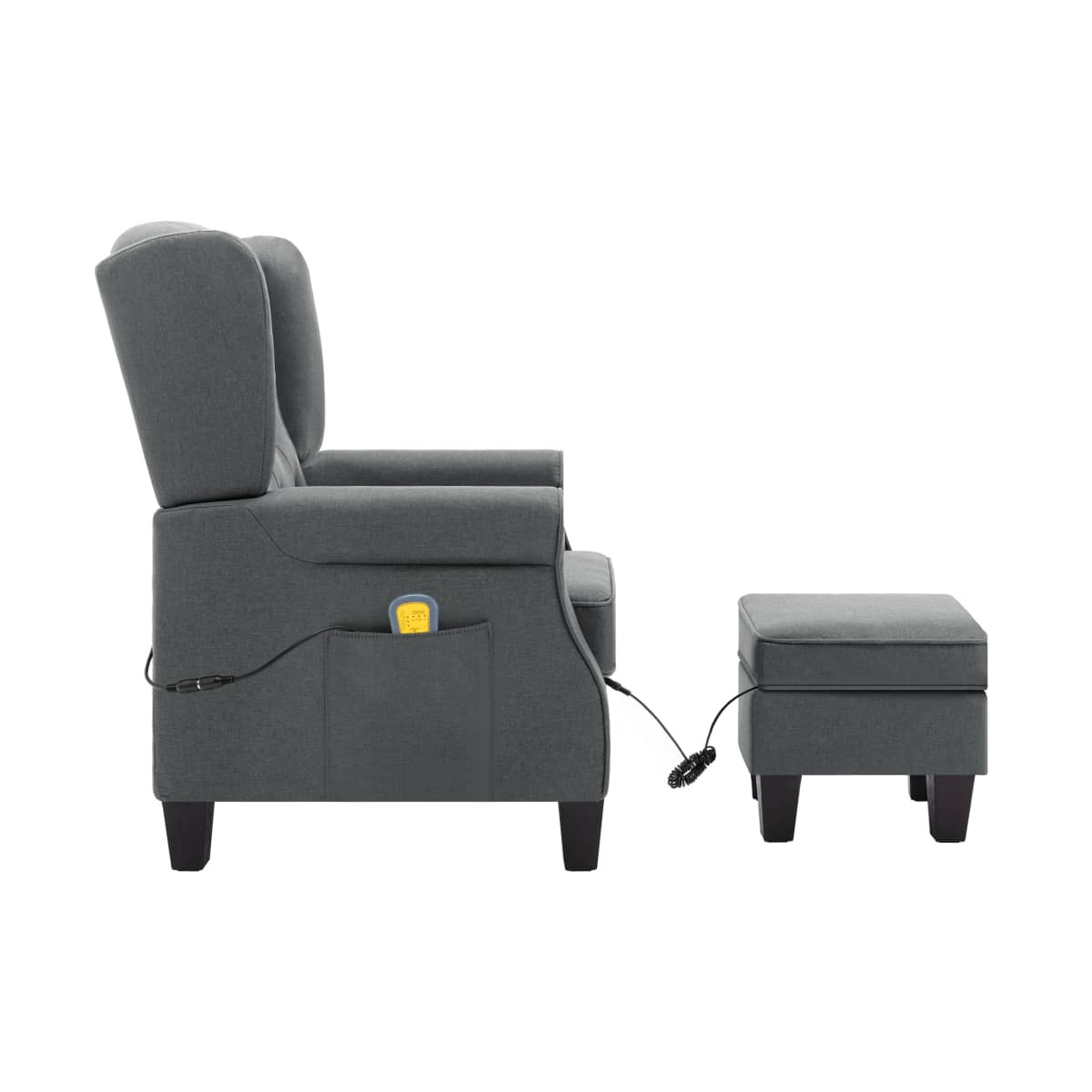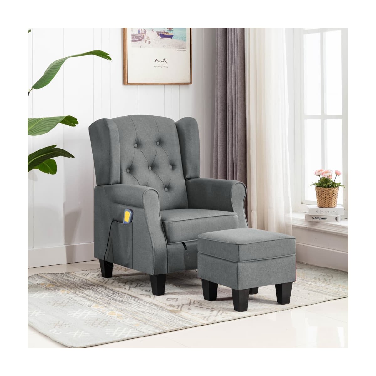 El sillón de masaje con un taburete reposapiés le da un look moderno a la decoración de tu hogar y es perfecto para el salón. El sillón de masaje eléctrico está hecho de tela y relleno de espuma, lo que lo hace fuerte y suave para sentarse. Las patas de madera ofrecen estabilidad adicional para este sillón. Este sillón de masaje cuenta con un respaldo de ala alta y una amortiguación profunda que brinda una gran comodidad. El sillón de masaje cuenta con 4 puntos de masaje para la espalda y el asiento, y el reposapiés tiene 2 puntos de masaje para las piernas. El mando a distancia incluido permite elegir diferentes programas de masaje. El sillón de masaje de TV también está equipado con un bolsillo lateral para el mando a distancia. El reposapiés está relleno de algodón PP, y su parte superior es desmontable. Nota: El producto tiene un conector USB, pero la fuente de alimentación USB de 5V certificada no está incluida.
